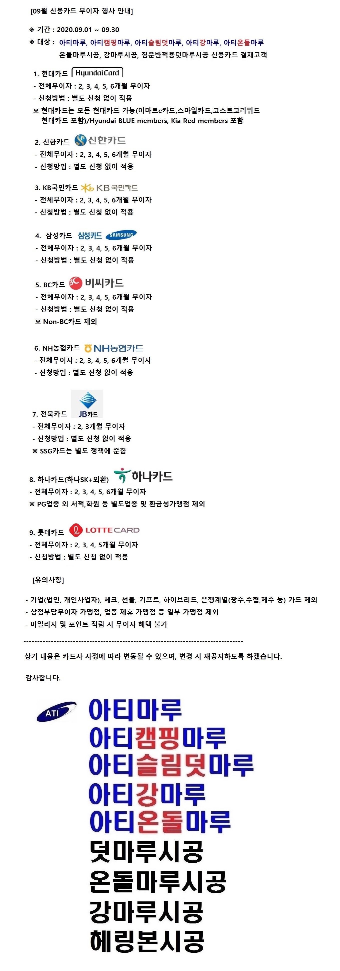 '20년 9월 ATI 아티마루에서는 아티슬림덧마루, 아티캠핑마루, 아티강마루, 아티온돌마루, 강마루, 온돌마루 및 덧마루시공, 강마루시공, 온돌마루시공, 헤링본시공에 대한 신용카드 무이자 [부분무이자]행사를 진행합니다.