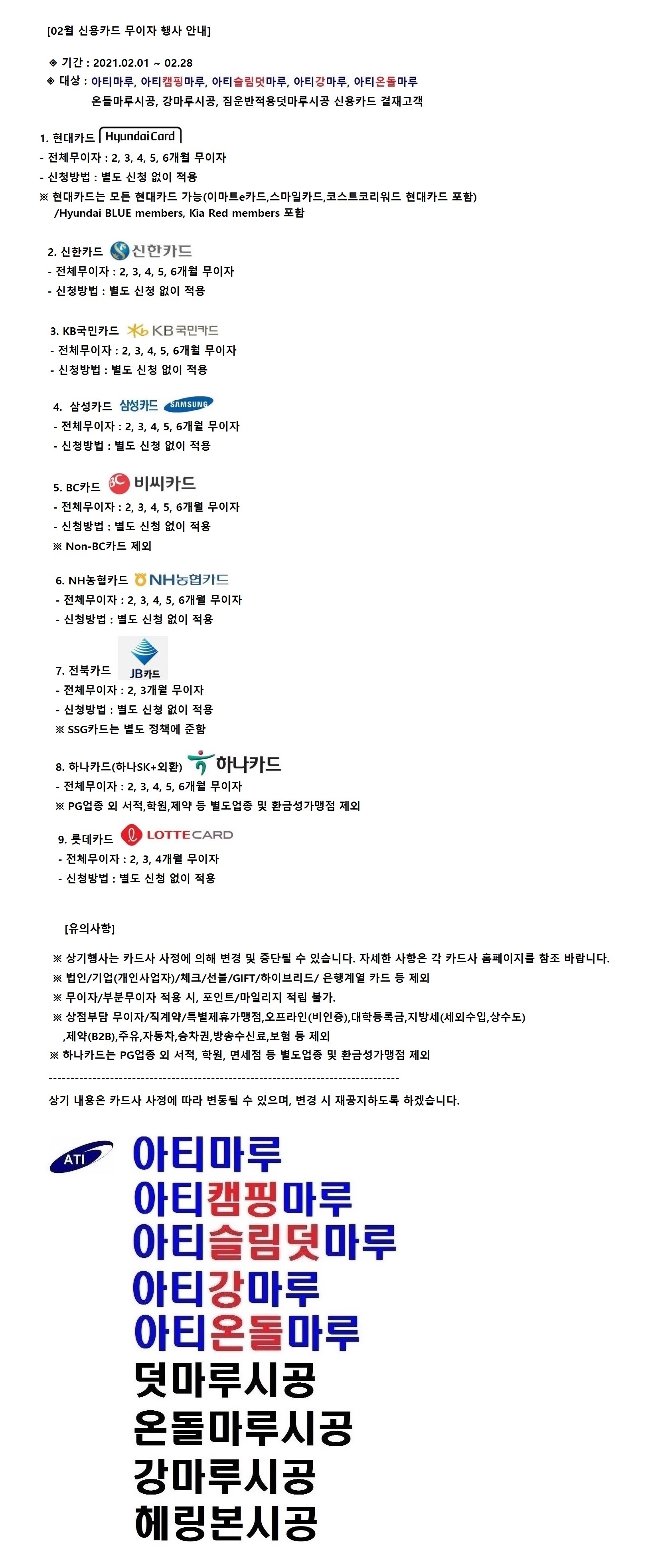 | [2021년 3월] ATI 아티마루 신용카드 무이자 및 부분무이자 행사안내 (0) | 2021.03.02 |