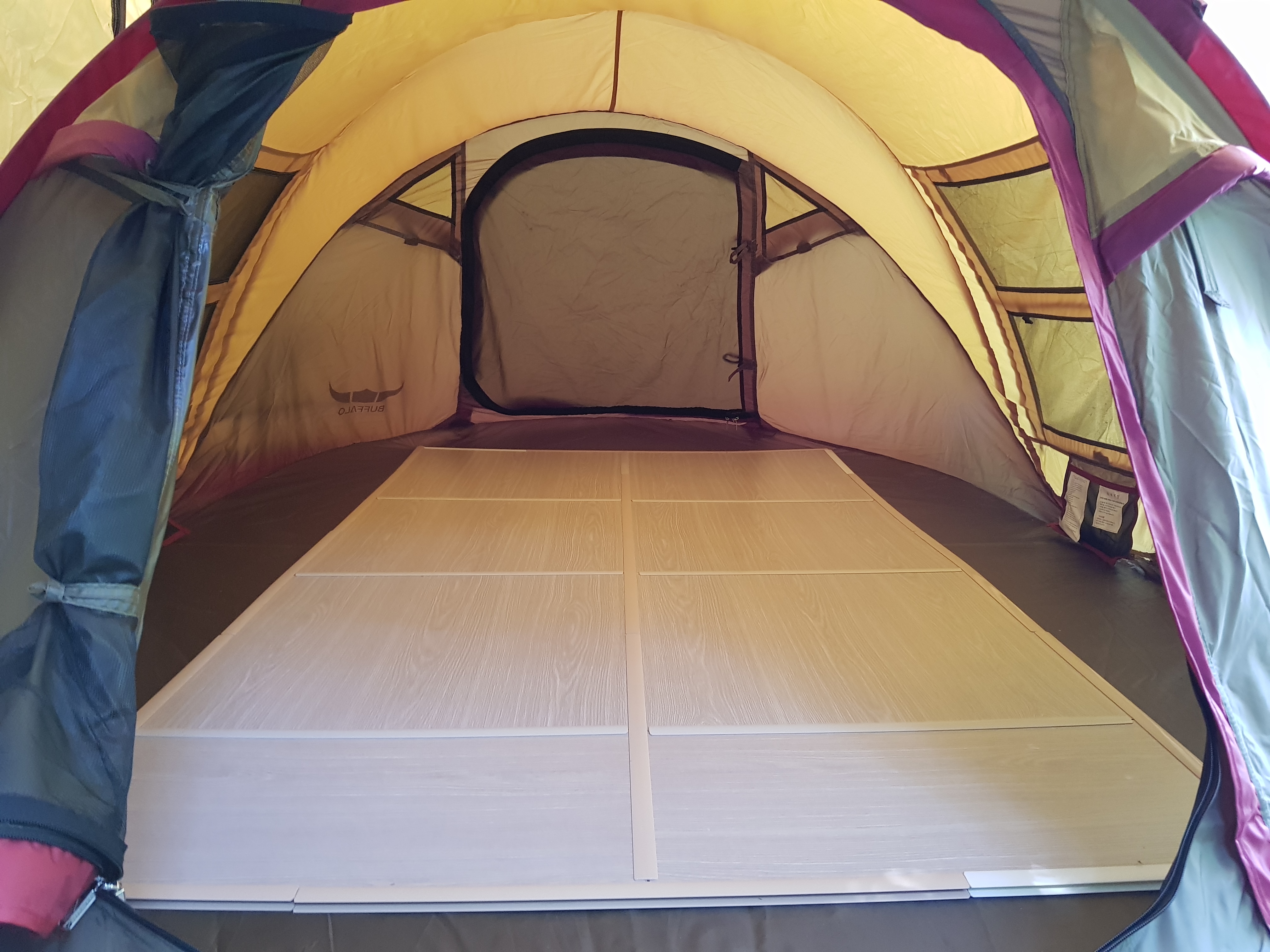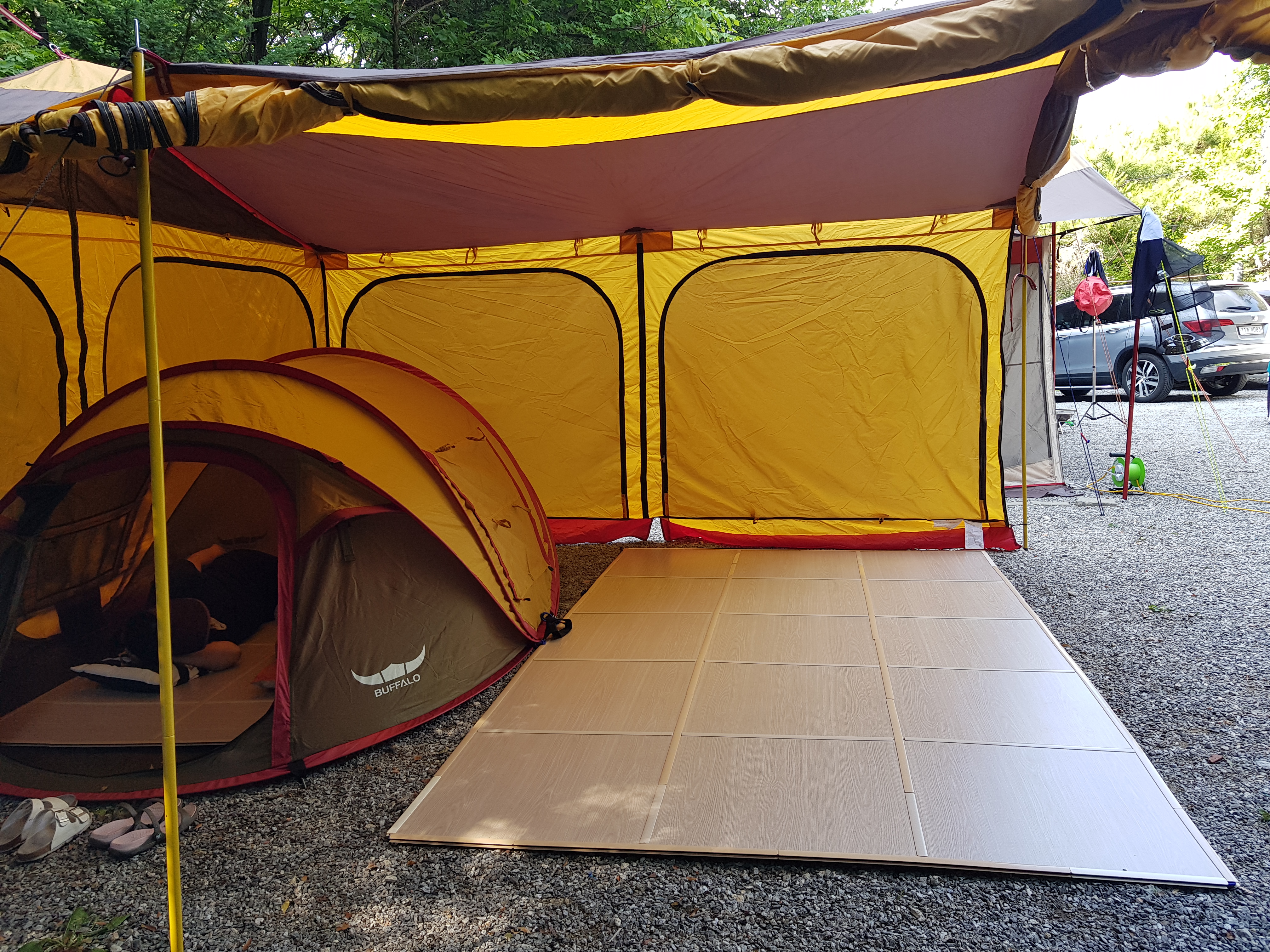 캠핑장의 파쇄석 바닥위에 설치한 캠핑텐트안 조립식 강마루바닥재를 사용할 경우 평타도개선 및 바닥에서 올라오는 방습보완과 PVC매트와 달리 피부에 닫는 촉감개선, 집안에서와 같은 강마루바닥의 느낌그대로 야외에서 캠핑을 즐겁게 할 수 있는 장점이 있습니다.