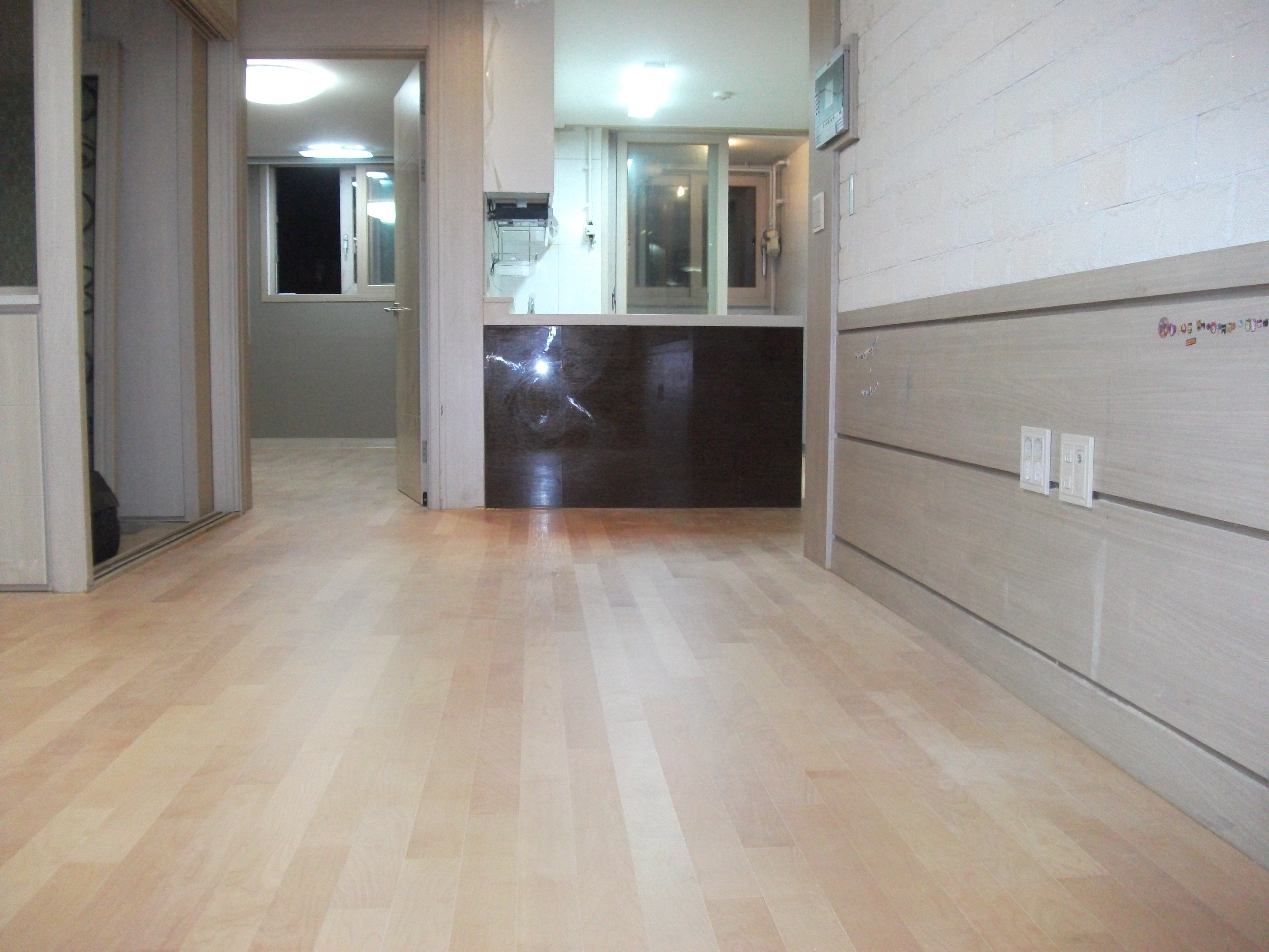 경기도 광명시 철산두산위브아파트 거실 및 주방에 대한 이사하기전 빈집에 대한 아티슬림덧마루_강마루시공으로 빠른시간내에 마루새단장 완료사례입니다.