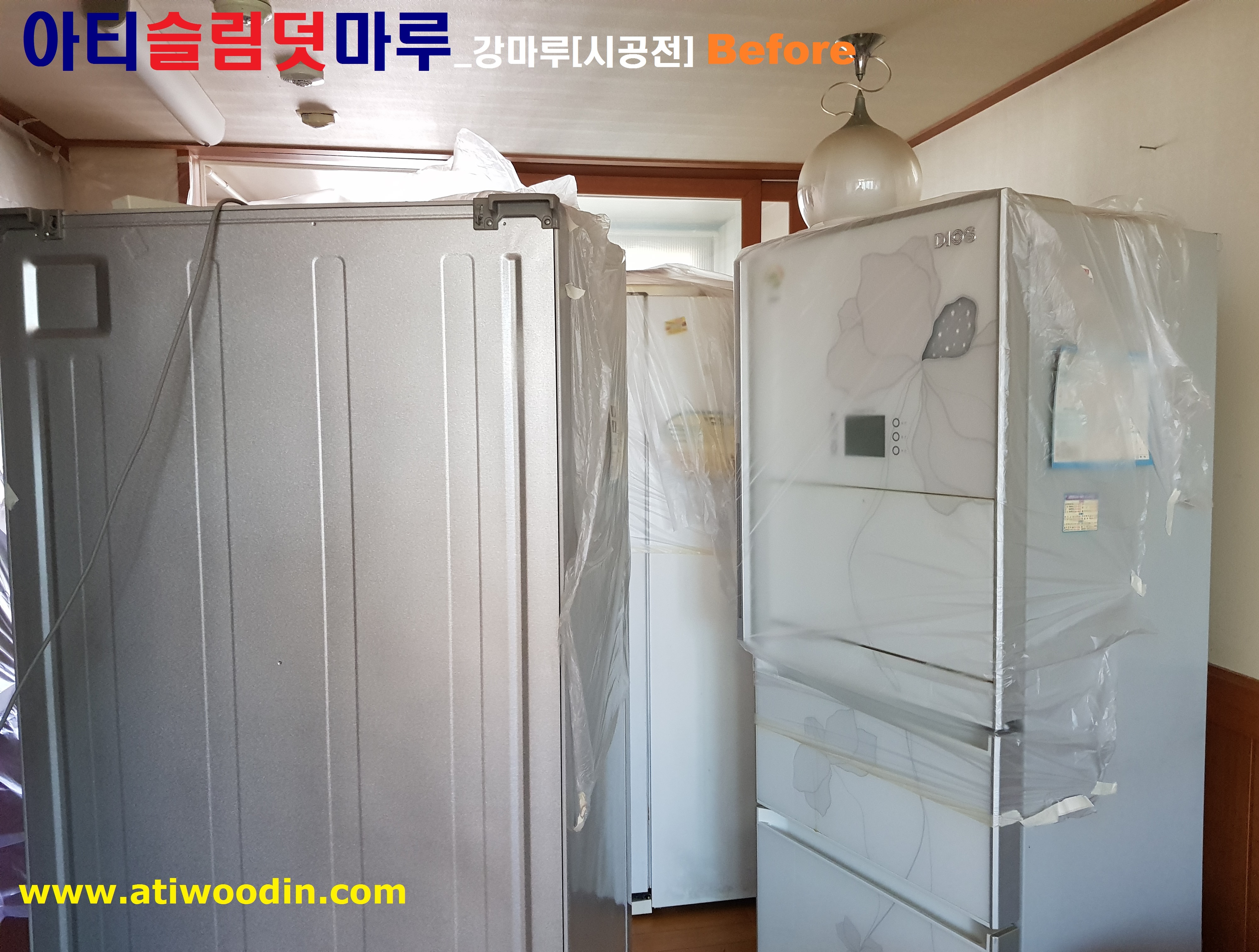 2. 짐운반적용덧마루시공에 대한 사전준비작업- 거실 및 주방의 냉장고등 큰 짐에한 주방싱크대포함 비닐커버링작업