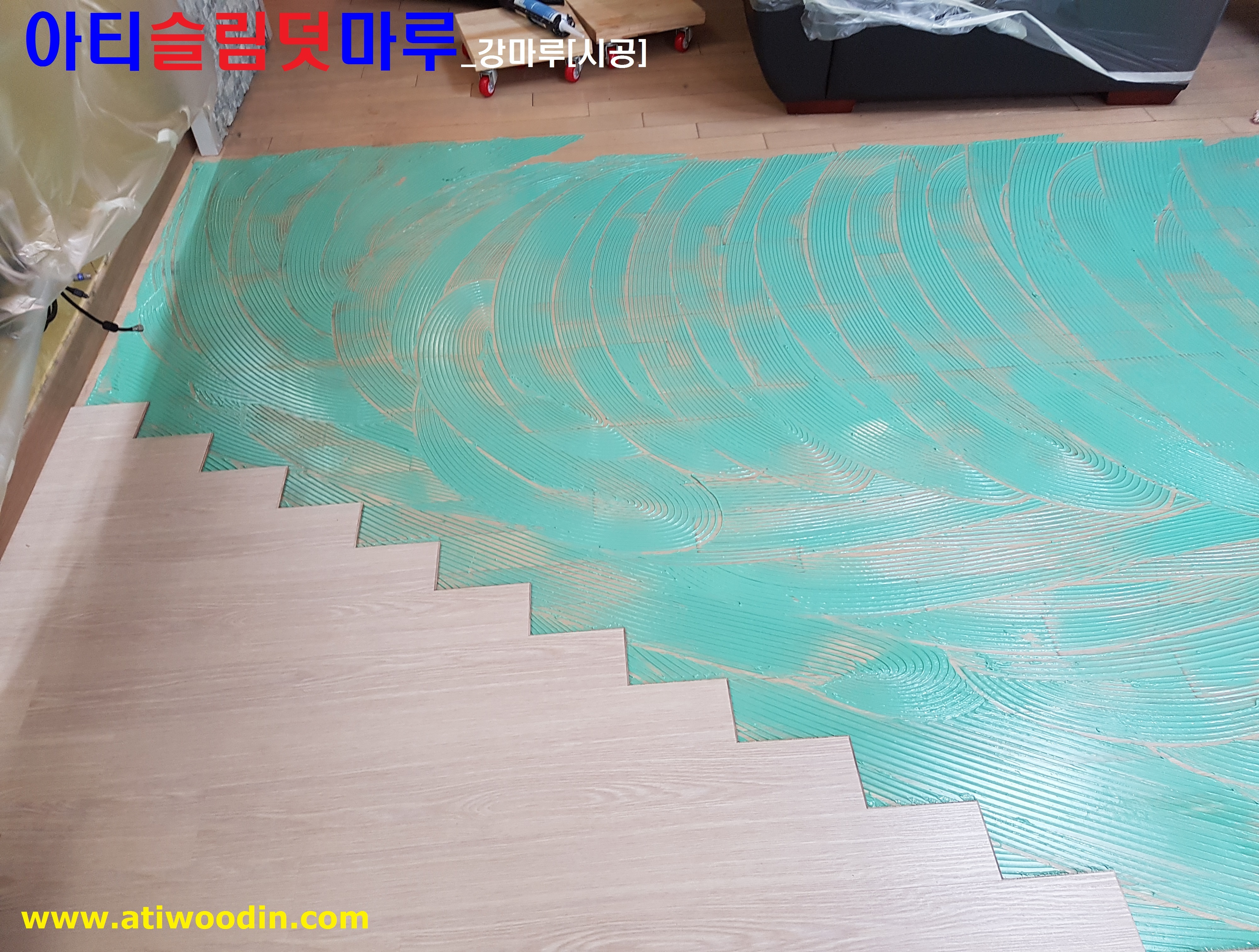 3. 짐운반적용덧마루시공- 냉장고,쇼파등 생활짐을 옮겨가면서 원목마루용 친환경접착제에의한 나무재질의 강마루제품으로 밀착시공