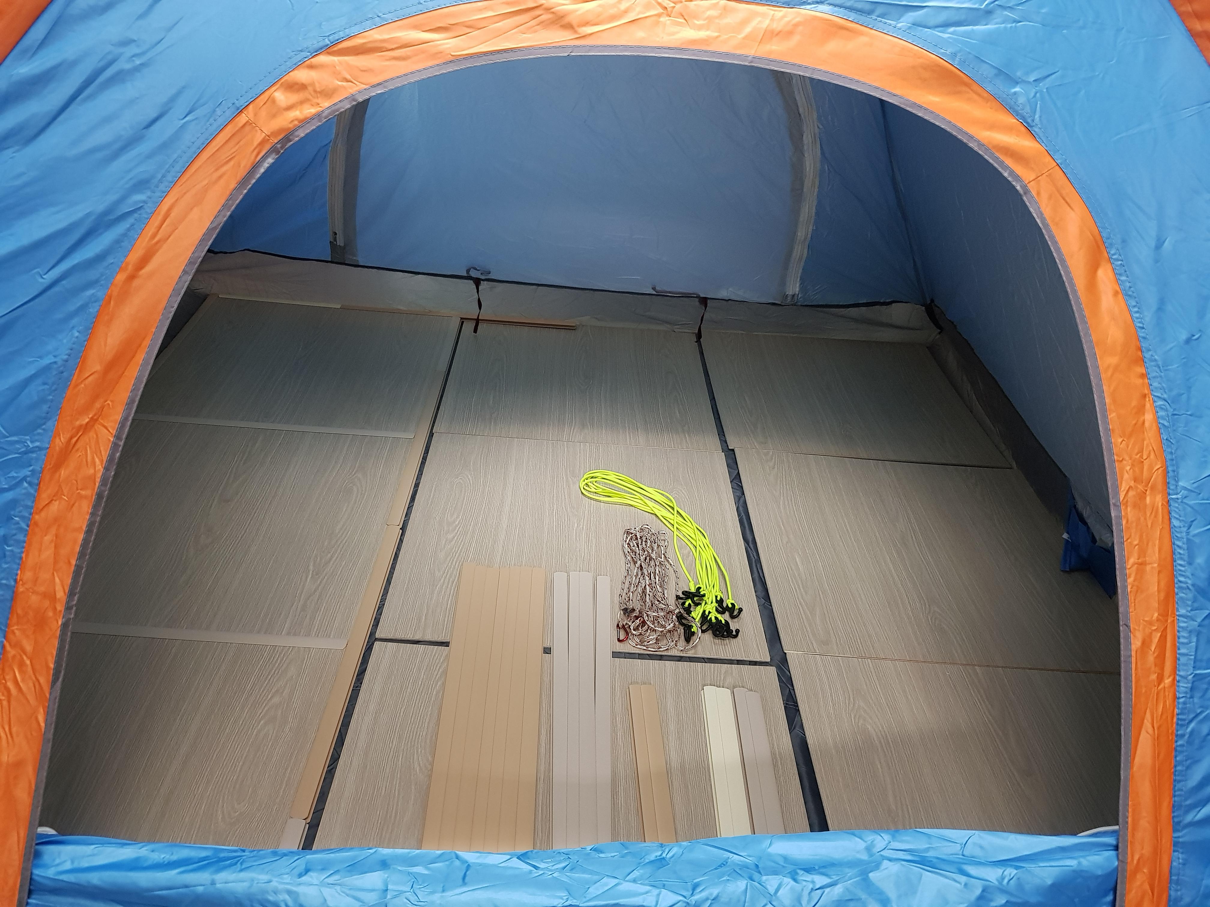 캠핑장의 파쇄석 바닥위에 설치한 캠핑텐트안 조립식 강마루바닥재를 사용할 경우 평타도개선 및 바닥에서 올라오는 방습보완과 PVC매트와 달리 피부에 닫는 촉감개선, 집안에서와 같은 강마루바닥의 느낌그대로 야외에서 캠핑을 즐겁게 할 수 있는 장점이 있습니다.