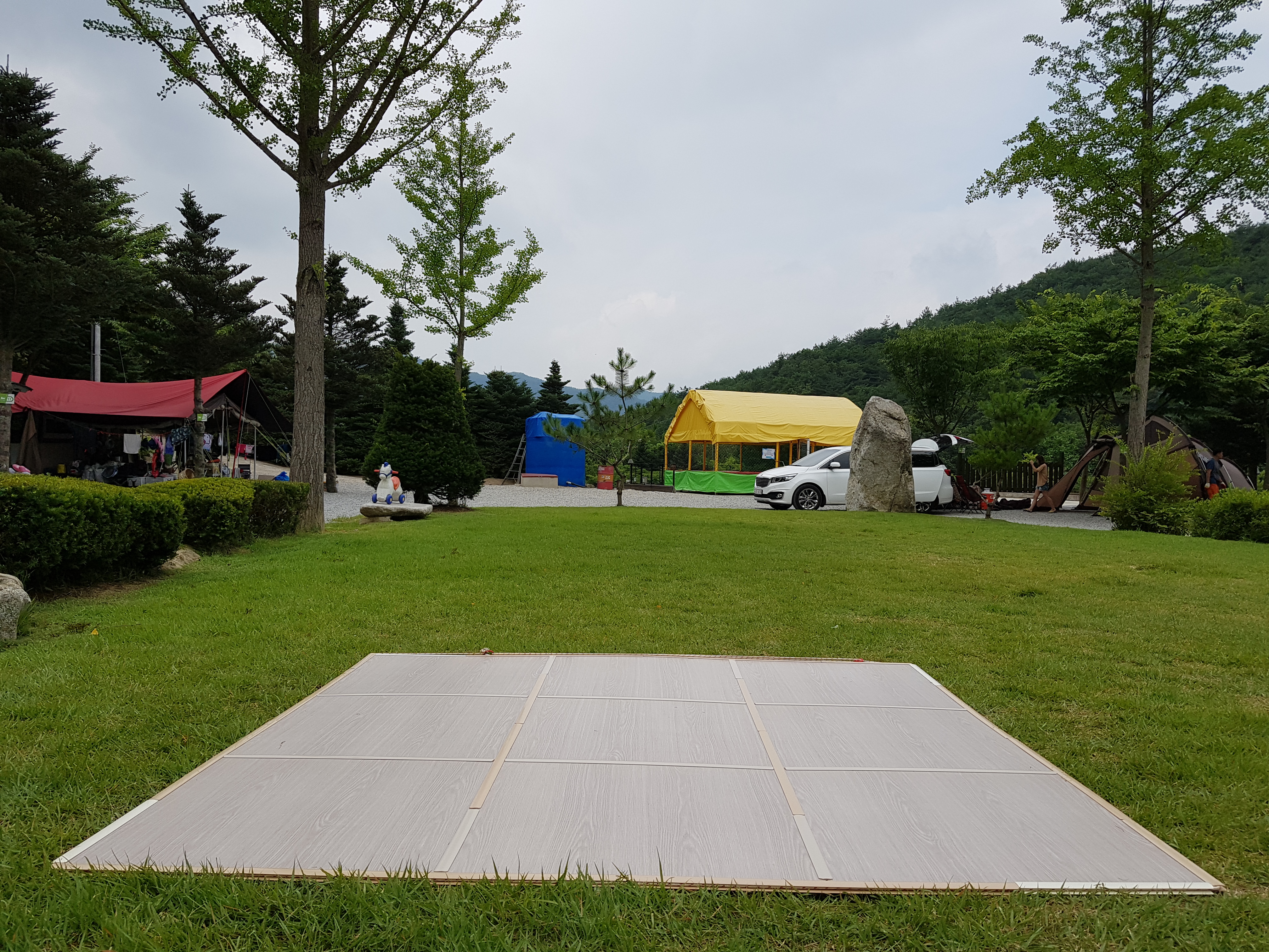 캠핑장의 파쇄석 바닥위에 설치한 캠핑텐트안 조립식 강마루바닥재를 사용할 경우 평타도개선 및 바닥에서 올라오는 방습보완과 PVC매트와 달리 피부에 닫는 촉감개선, 집안에서와 같은 강마루바닥의 느낌그대로 야외에서 캠핑을 즐겁게 할 수 있는 장점이 있습니다.