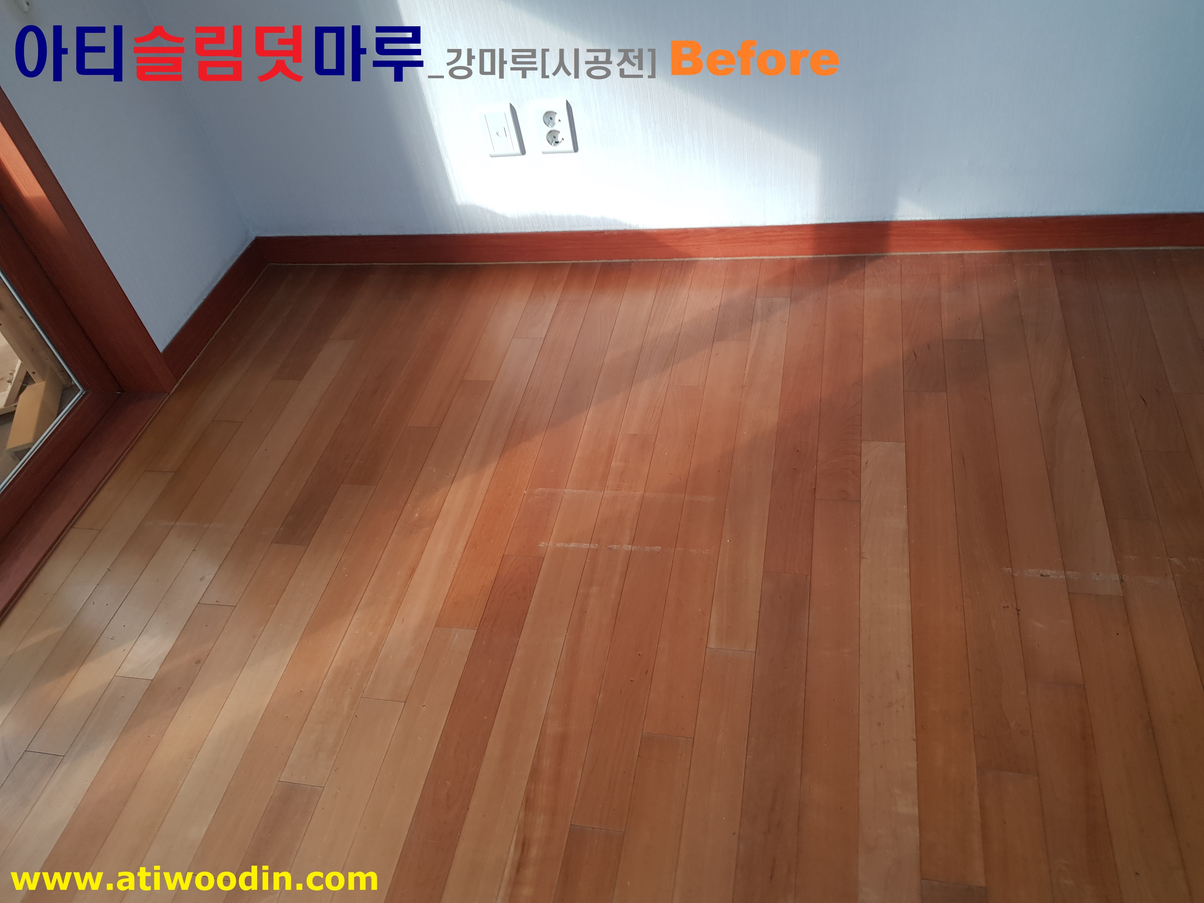 1. 짐운반적용덧마루시공전 - 색상변색 ,벚겨짐 및 긁힘등 노후바닥으로 덧마루시공전 Before