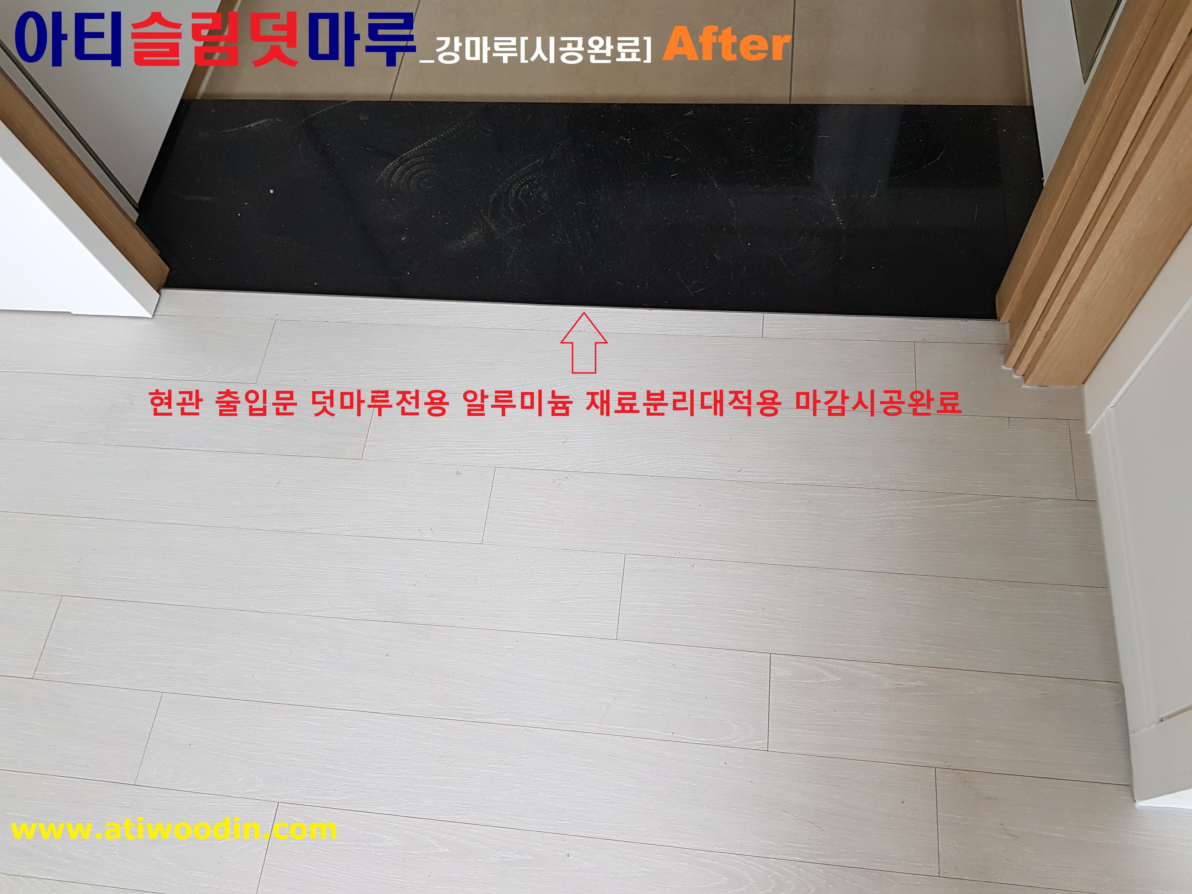 방문입구, 화장실입구, 현관입구의 마감이 필요할 경우는 덧마루전용 알루미늄재료분리대를 적용하여 깔끔하게 시공마감 진행을 합니다.