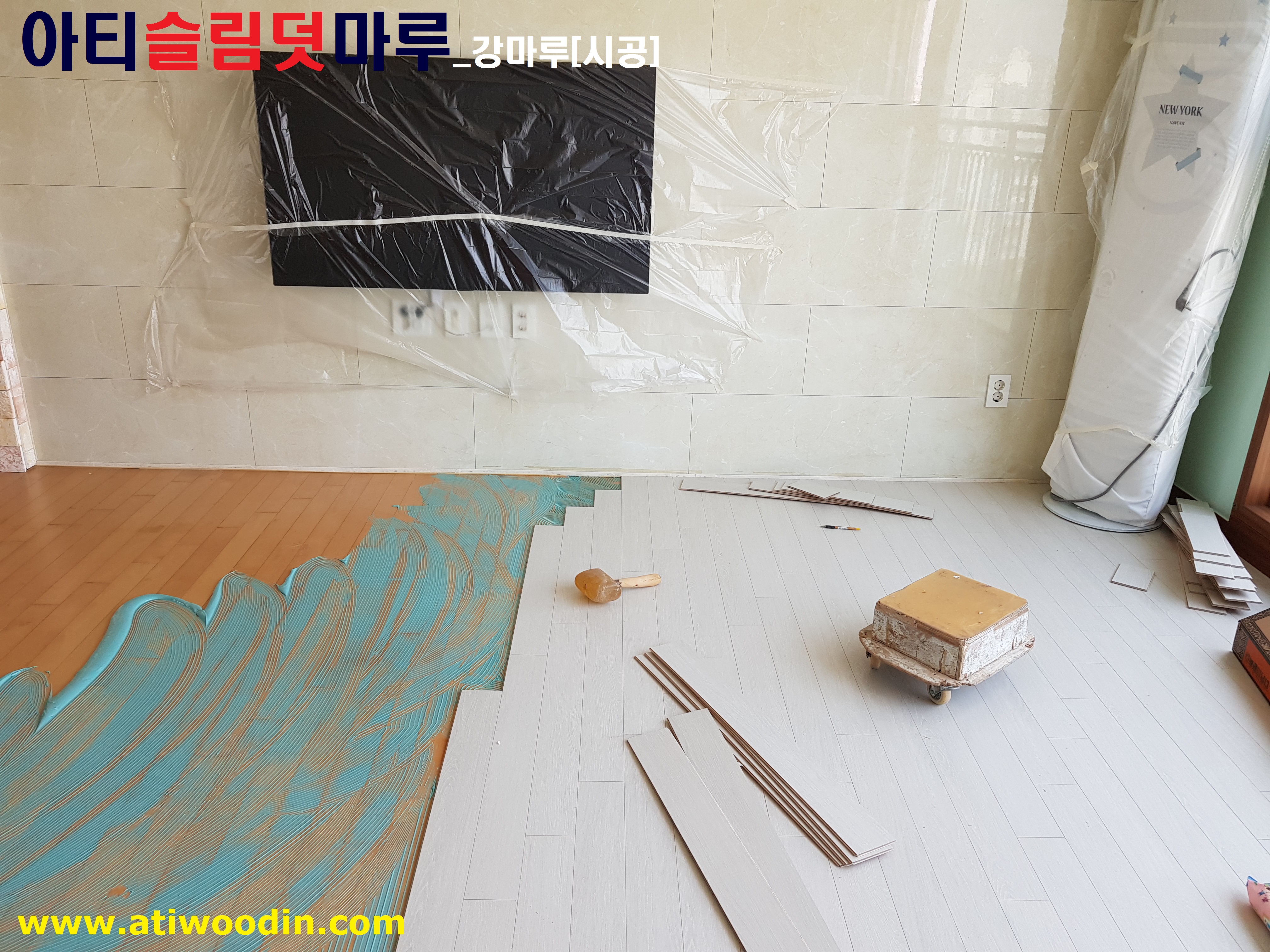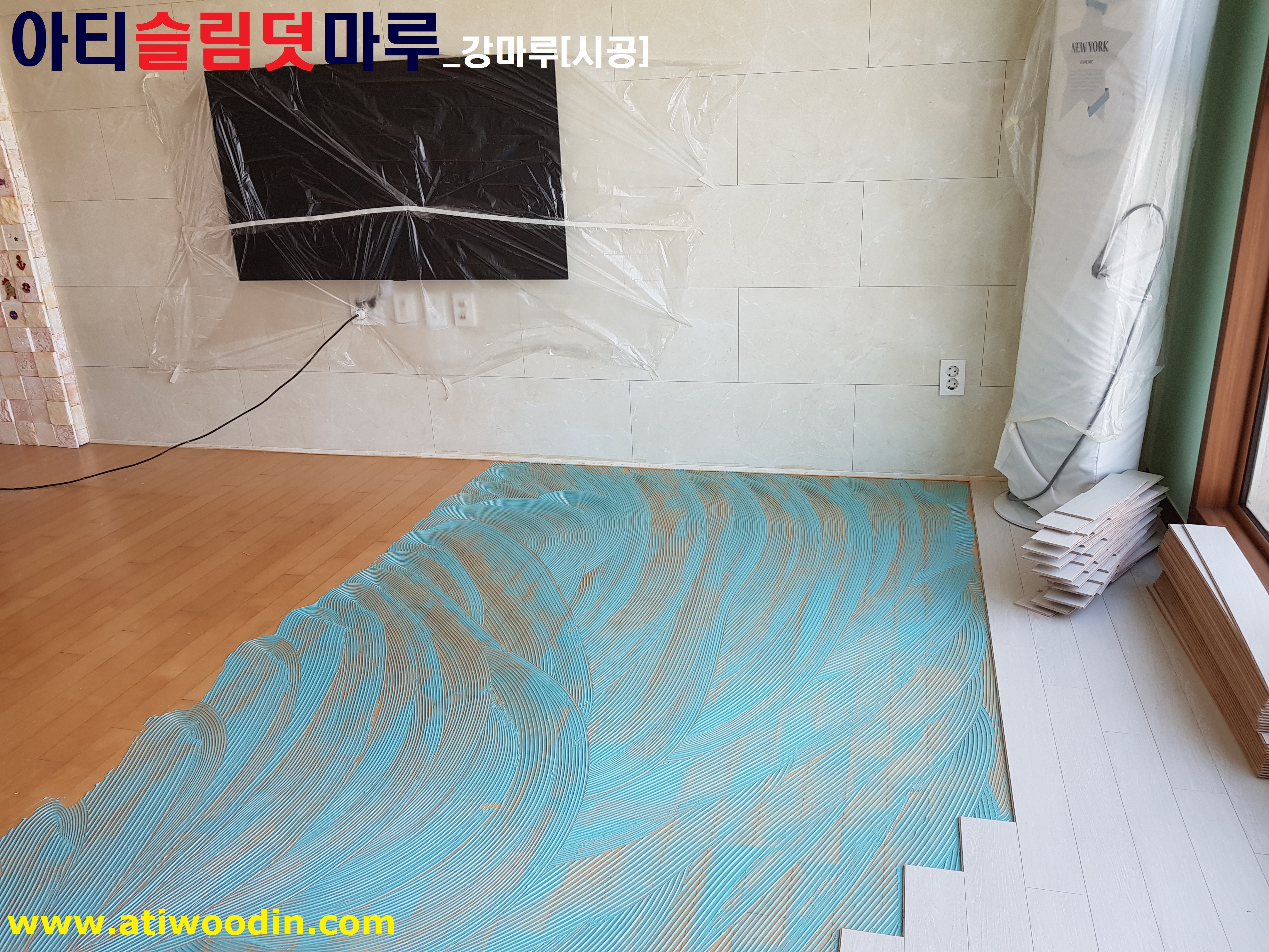 3. 짐운반적용덧마루시공- 냉장고,쇼파등 생활짐을 옮겨가면서 원목마루용 친환경접착제에의한 나무재질의 강마루제품으로 밀착시공