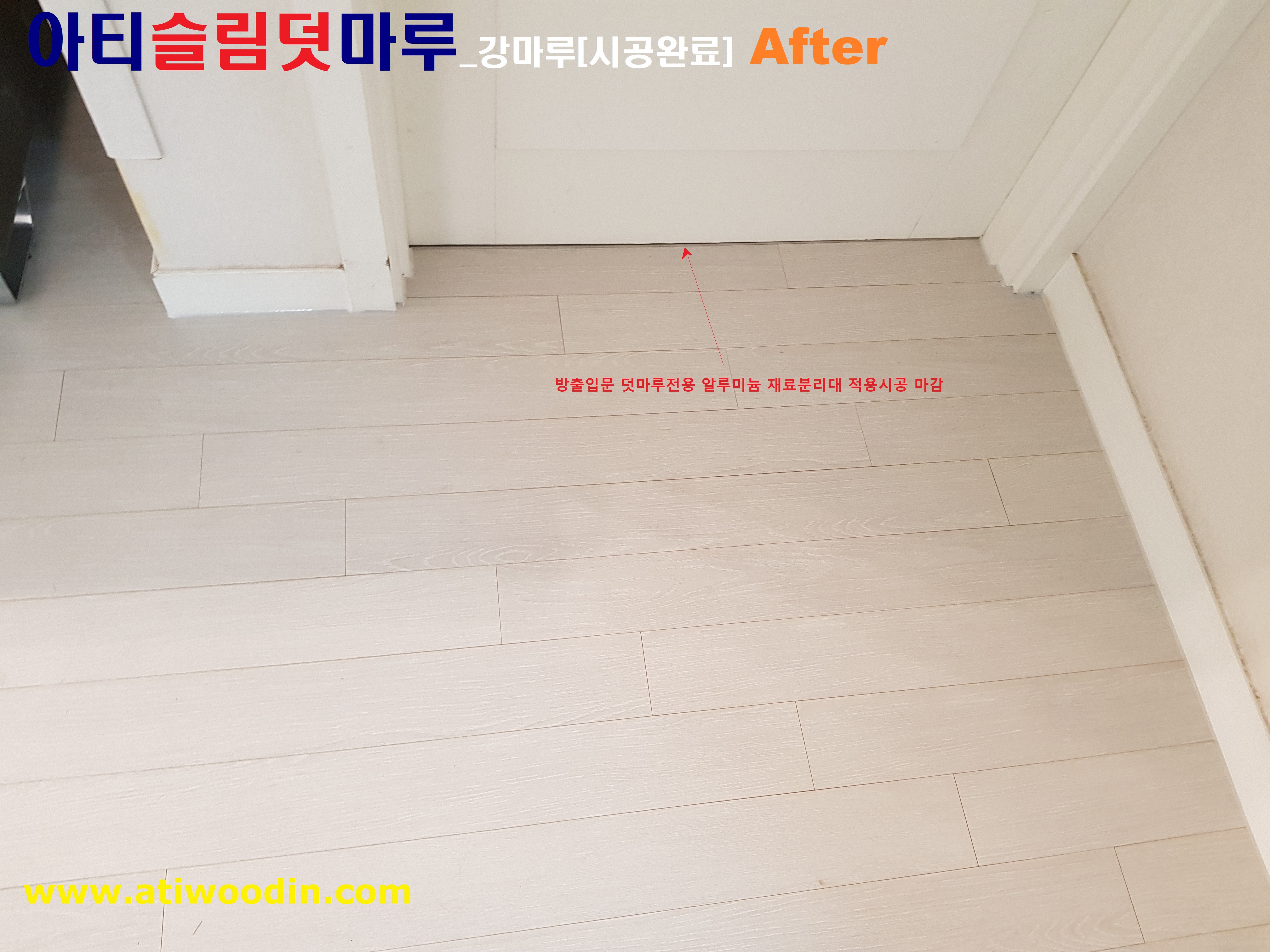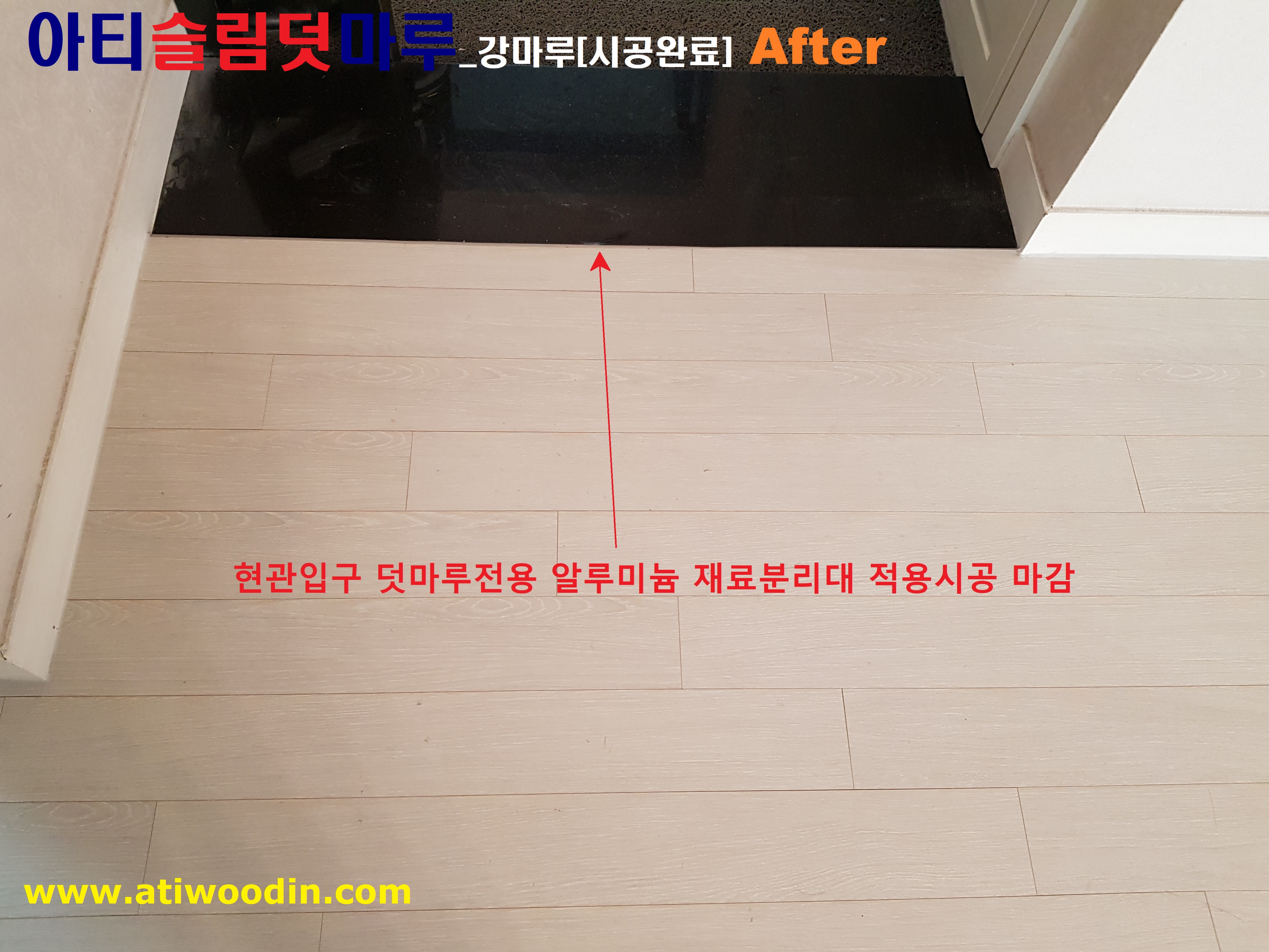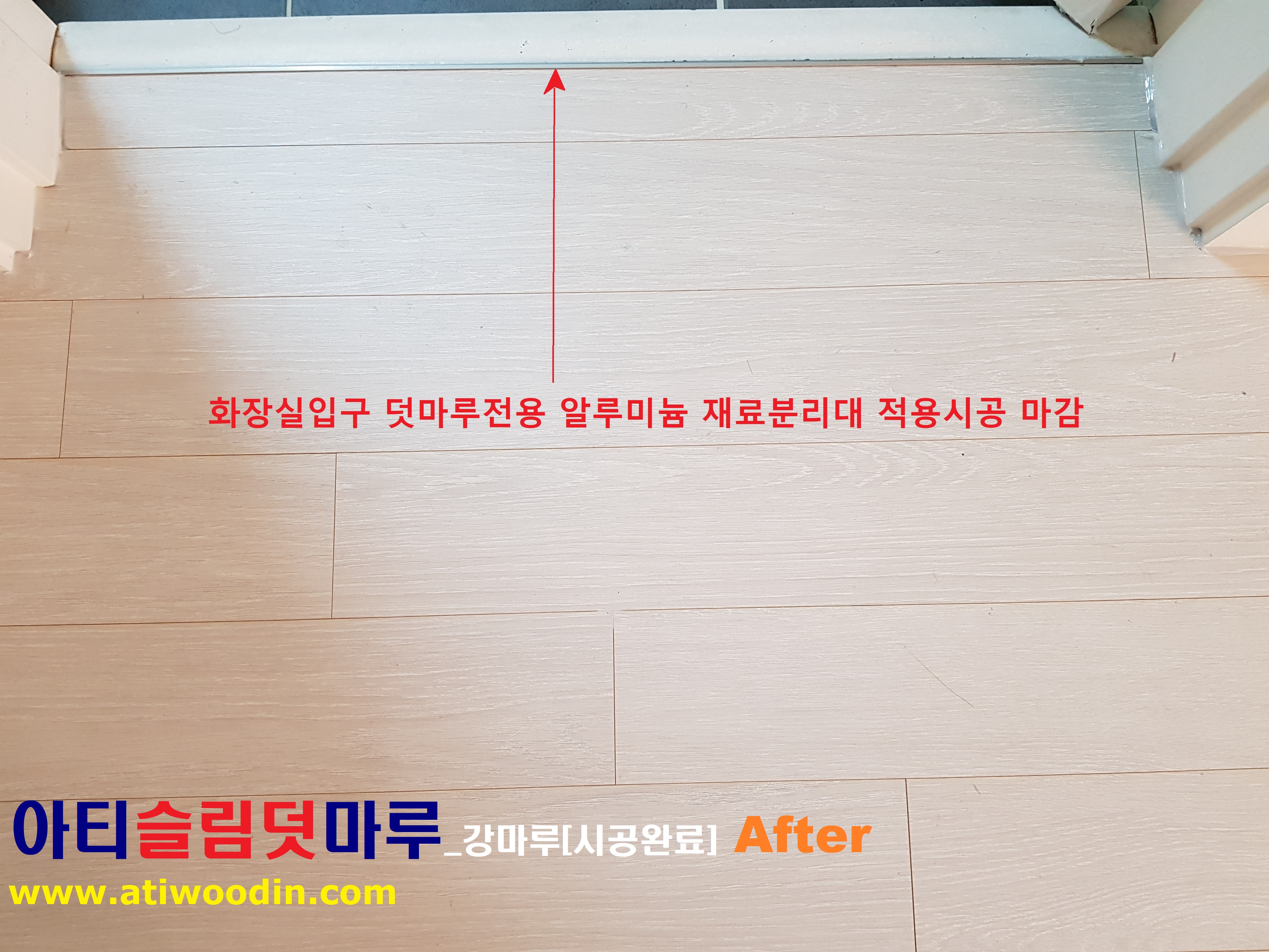 현관입구,화장실입구, 출입문방에 대한 마감은 덧마루전용 알루미늄재료분리대를 적용하여 깔끔하게 시공 마감하여 드립니다.