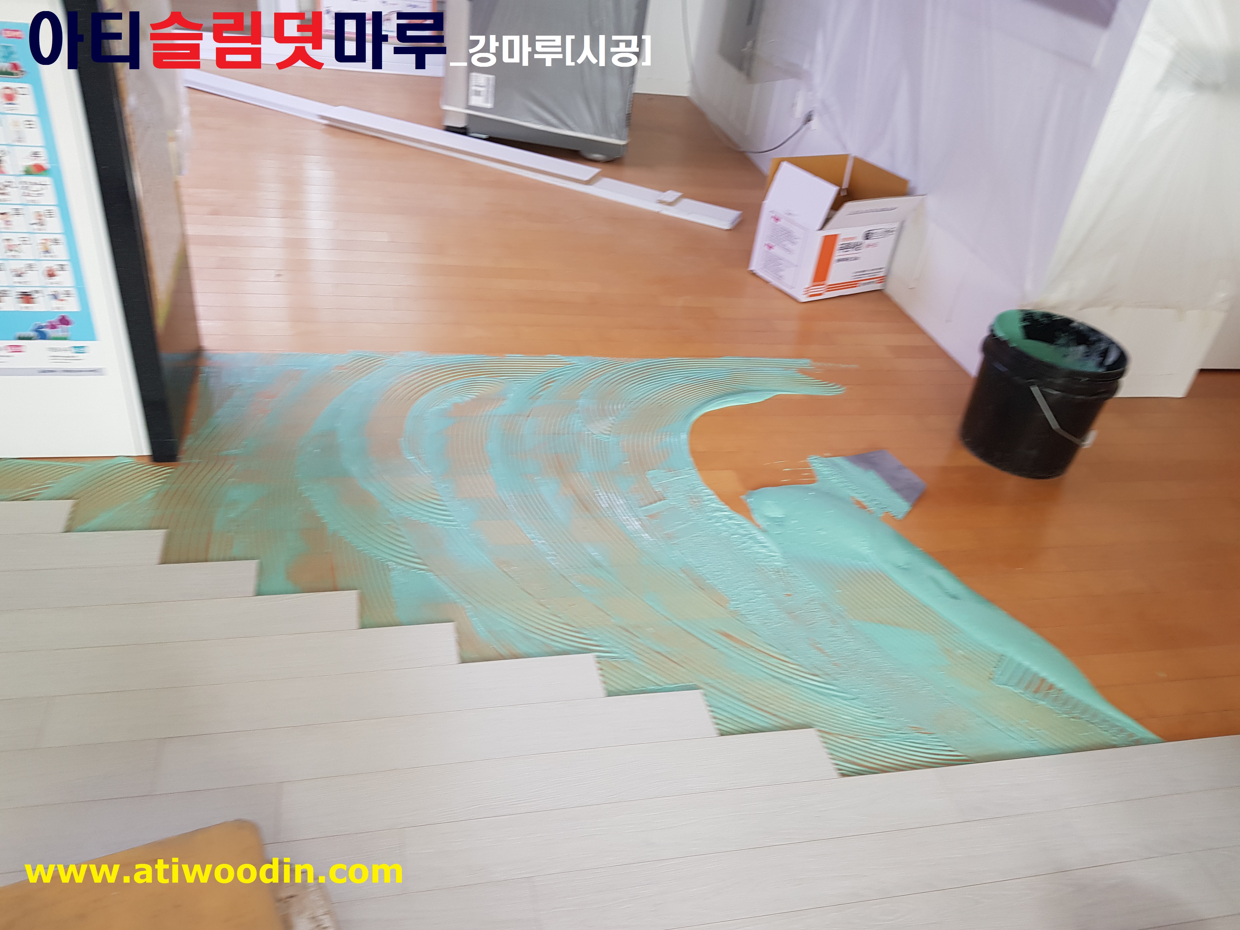 3. 짐운반적용덧마루시공 - 쇼파등 큰 짐을 옮겨가면서 원목마루용 친환경접착제에으한 나무재질의 강마루제품으로 밀착시공
