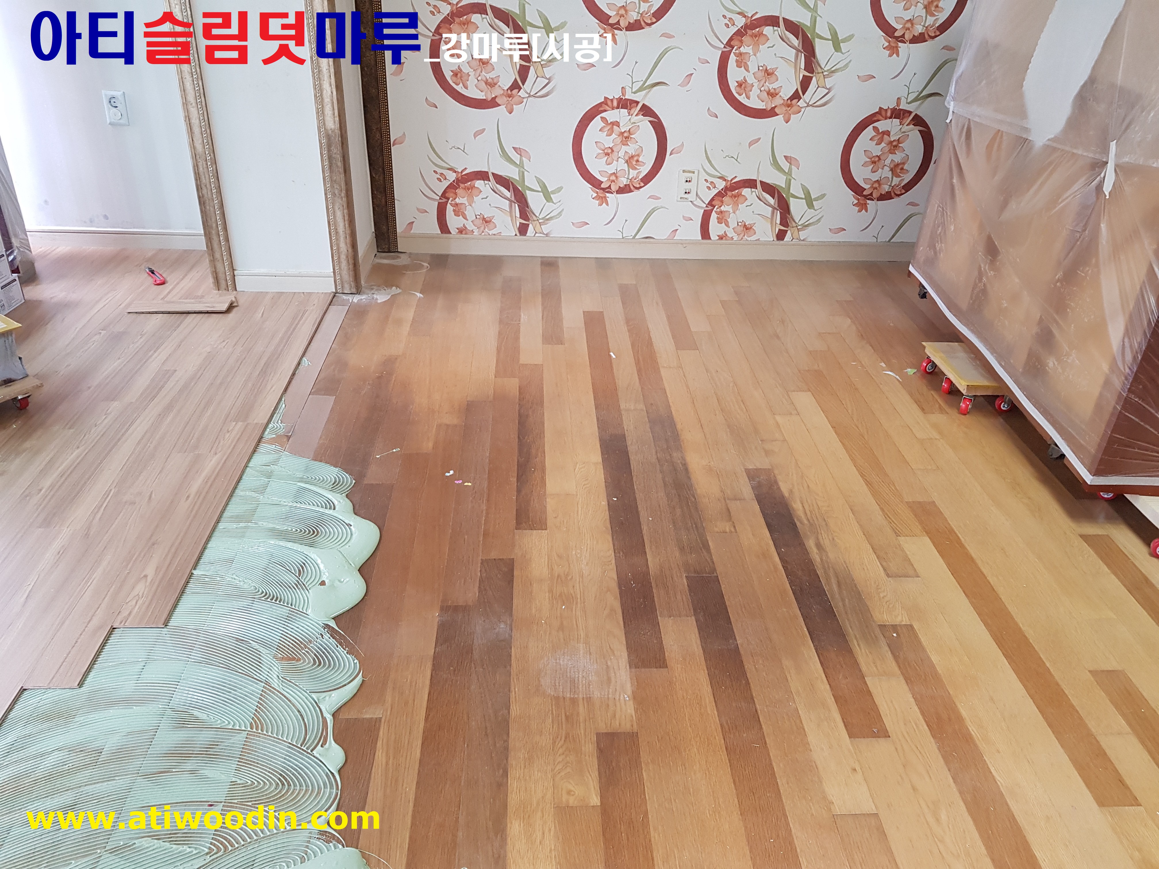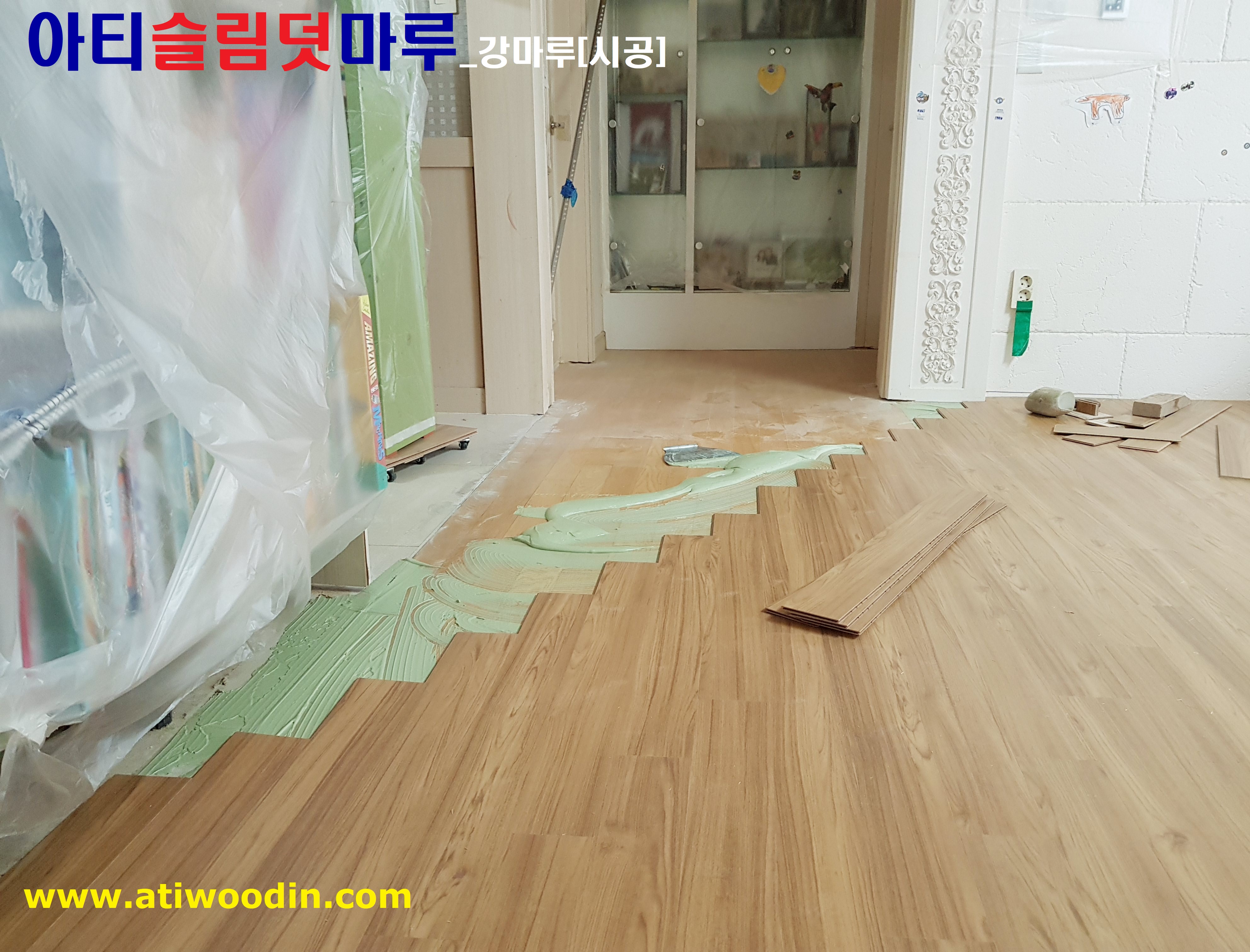 3. 짐운반적용덧마루시공-냉장고, 쇼파등 큰 짐을 옮기면서 원목마루용 친환경 접착제에의한 나무재질의 강마루바닥재 밀착 덧마루시공