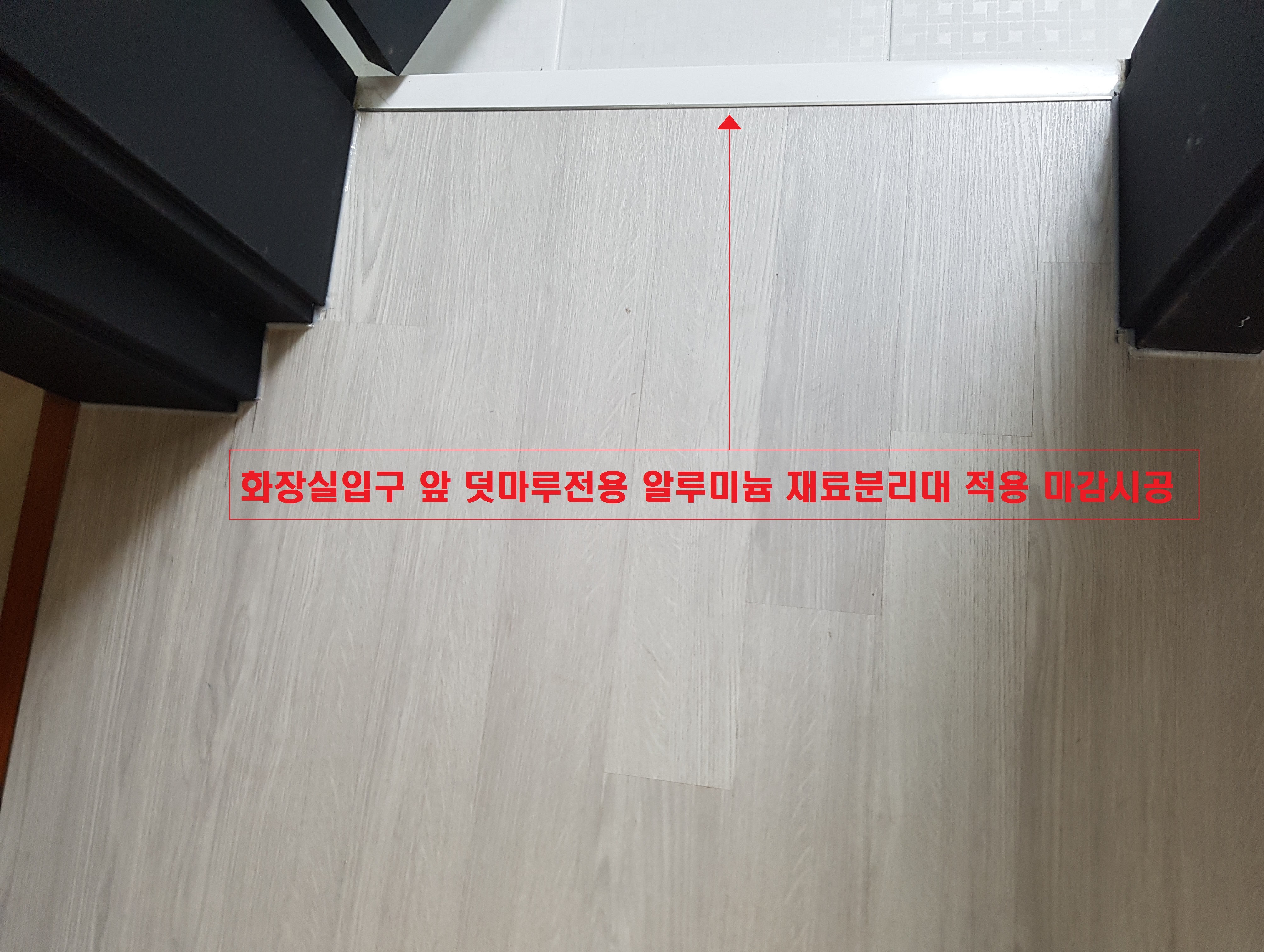 현관입구, 화장실입구, 침실방입구의 마감이 필요할 경우는 덧마루전용 알루미늄재료분리대를 적용하여 깔끔하게 시공마감 진행을 합니다.