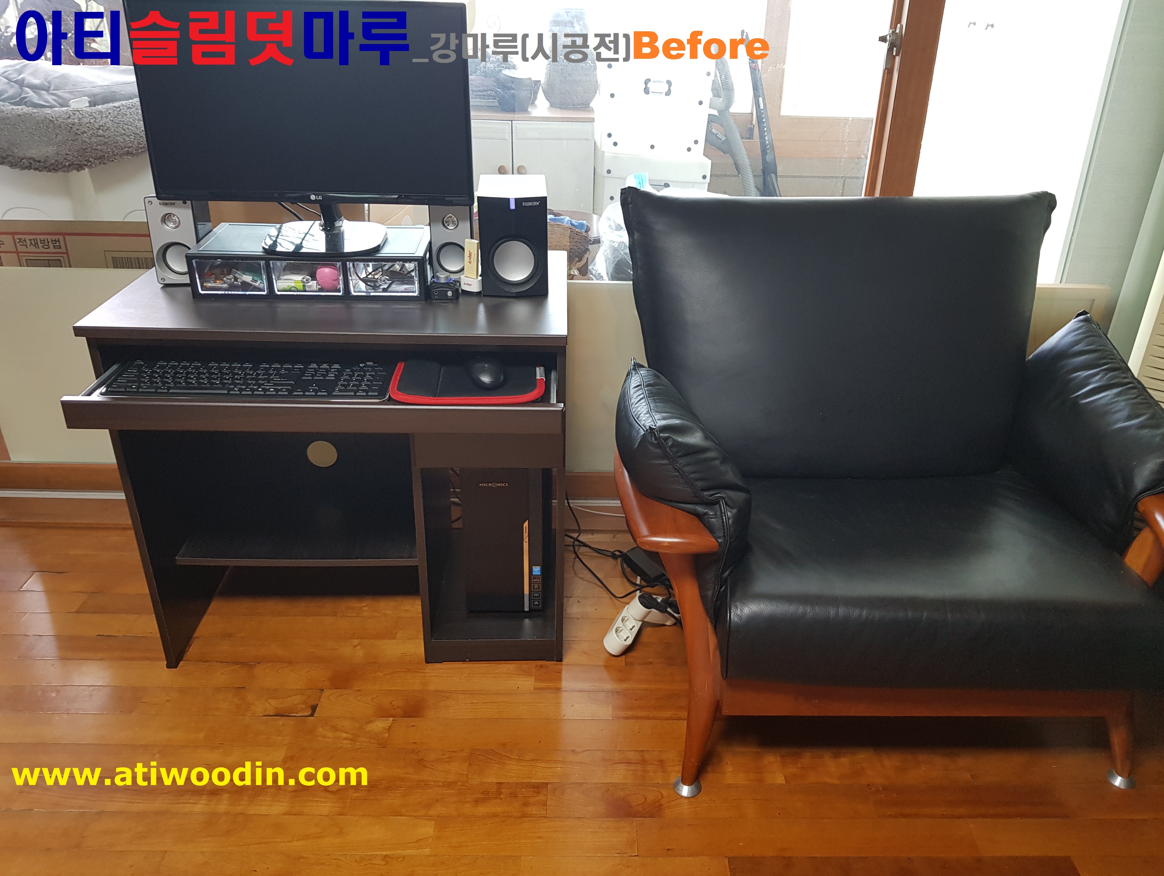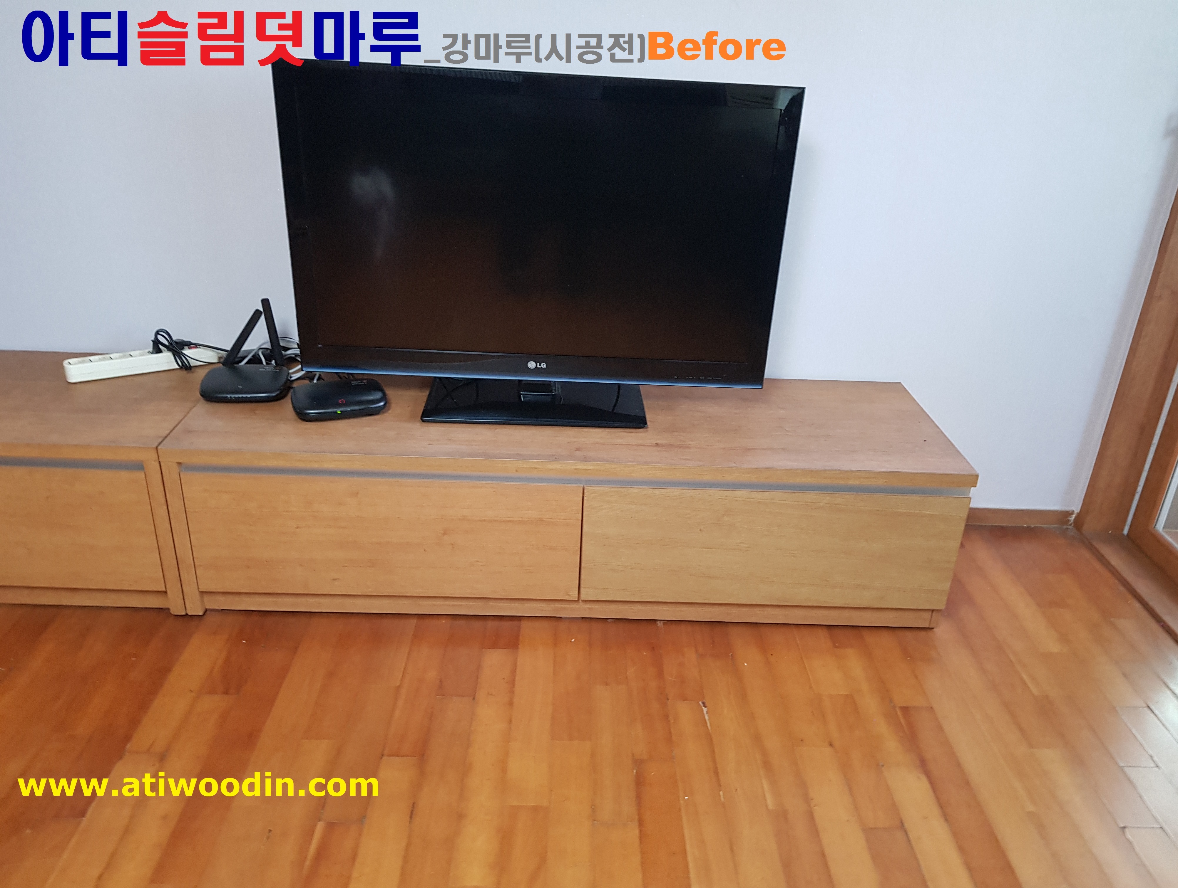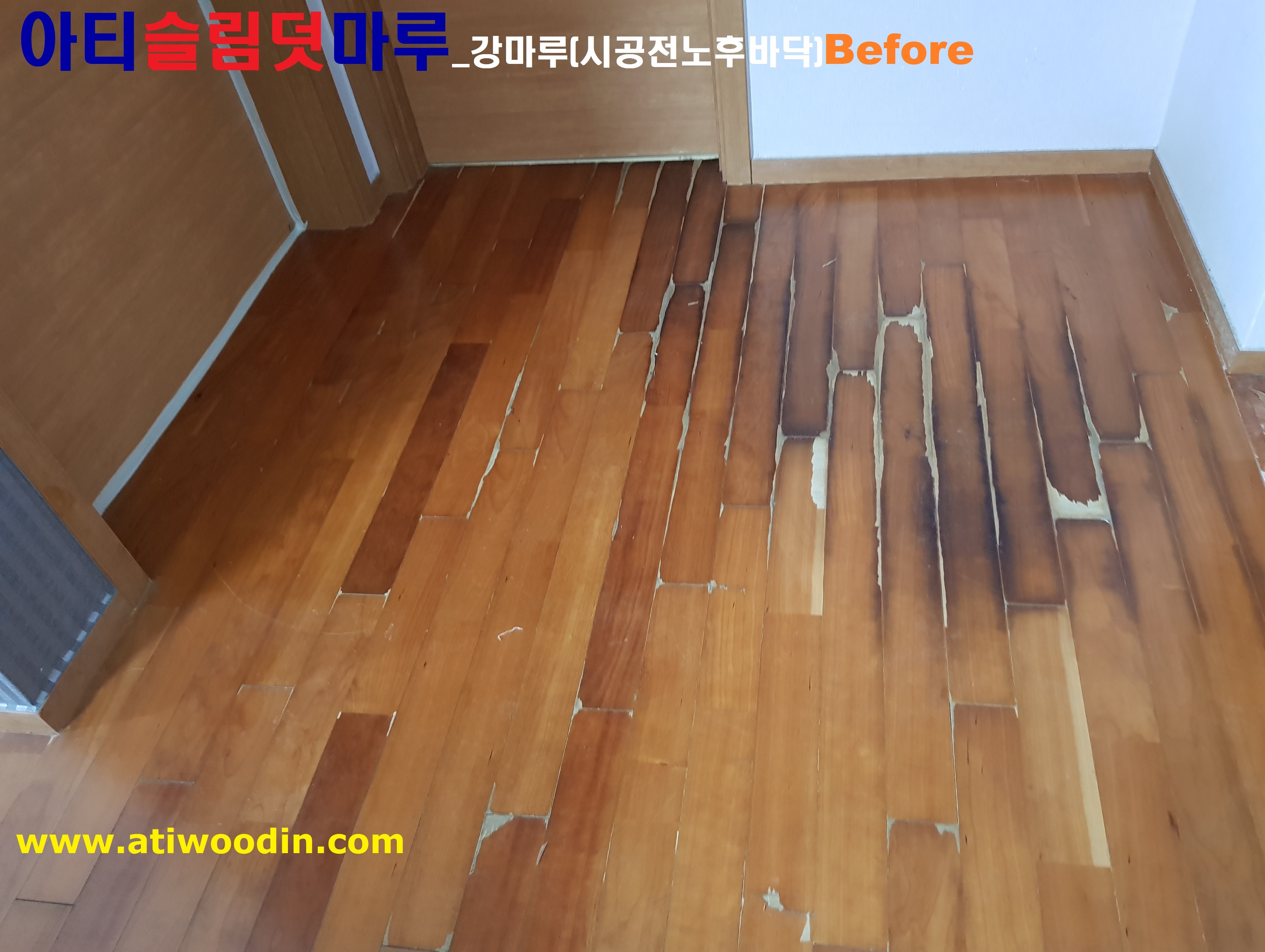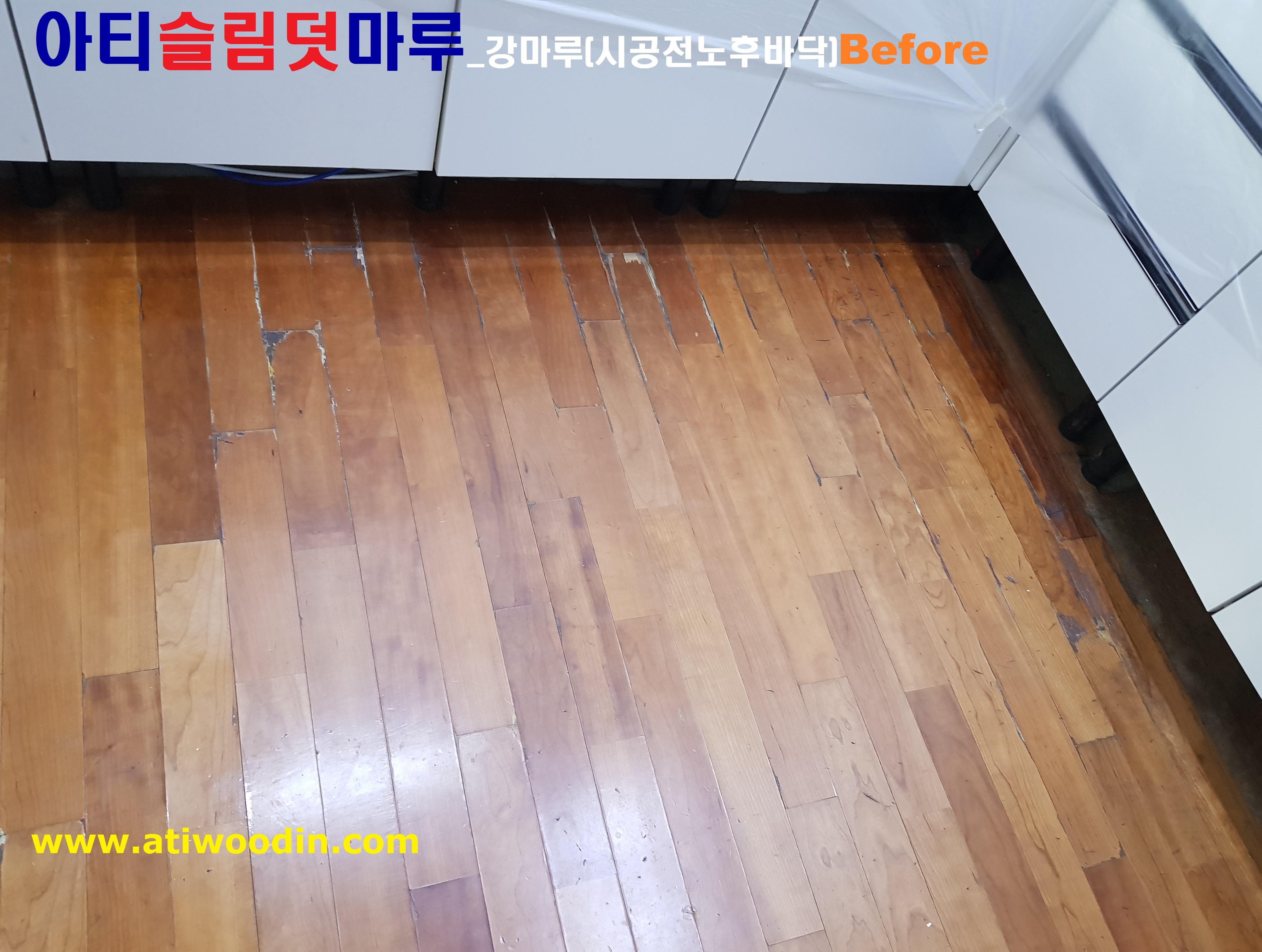 1. 짐운반적용덧마루시공전 - 색상변색 ,벚겨짐 및 긁힘등 노후바닥으로 덧마루시공전 Before