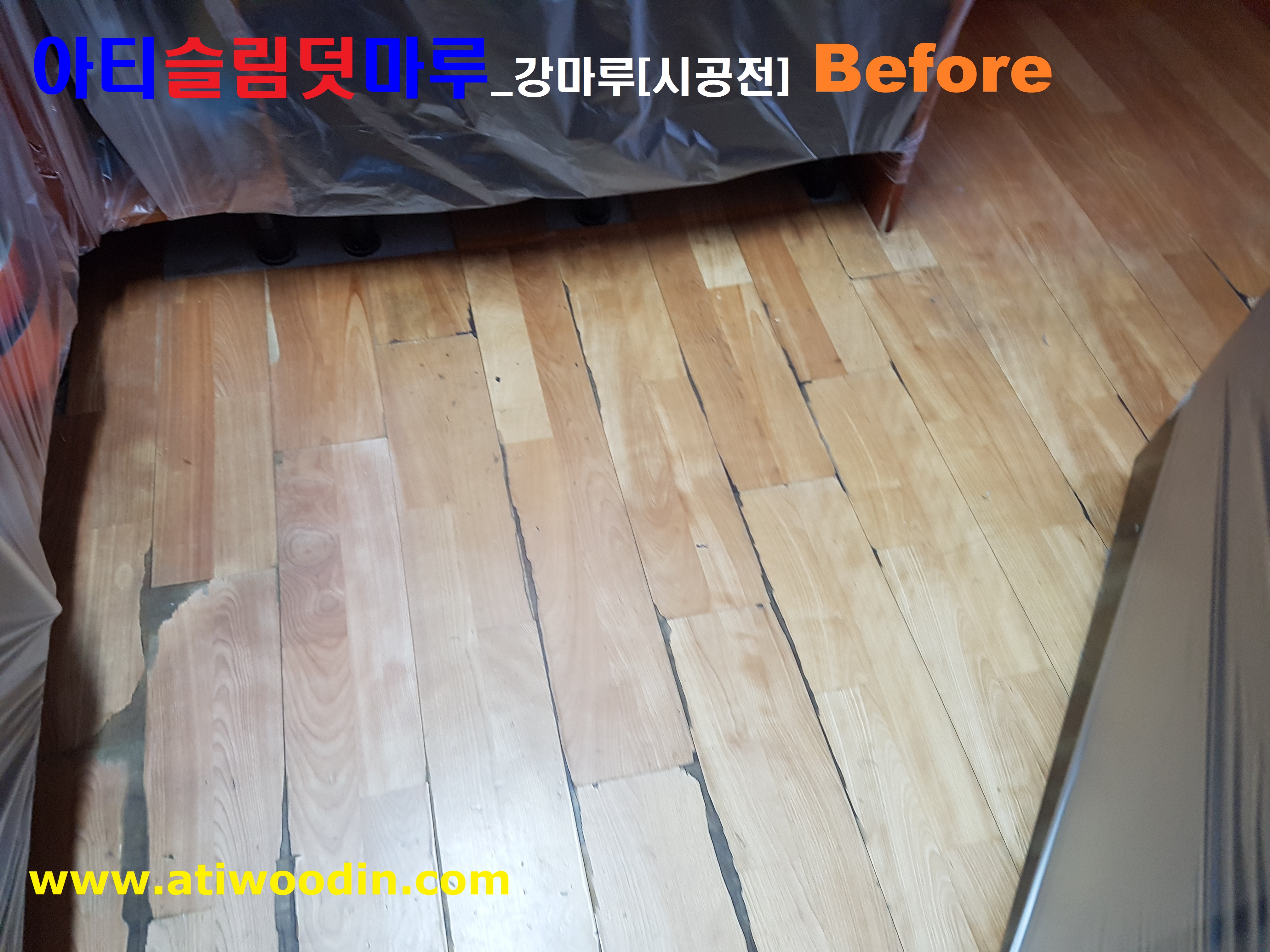 1. 짐운반적용덧마루시공전 - 색상변색 ,벚겨짐 및 긁힘등 노후바닥으로 덧마루시공전 Before