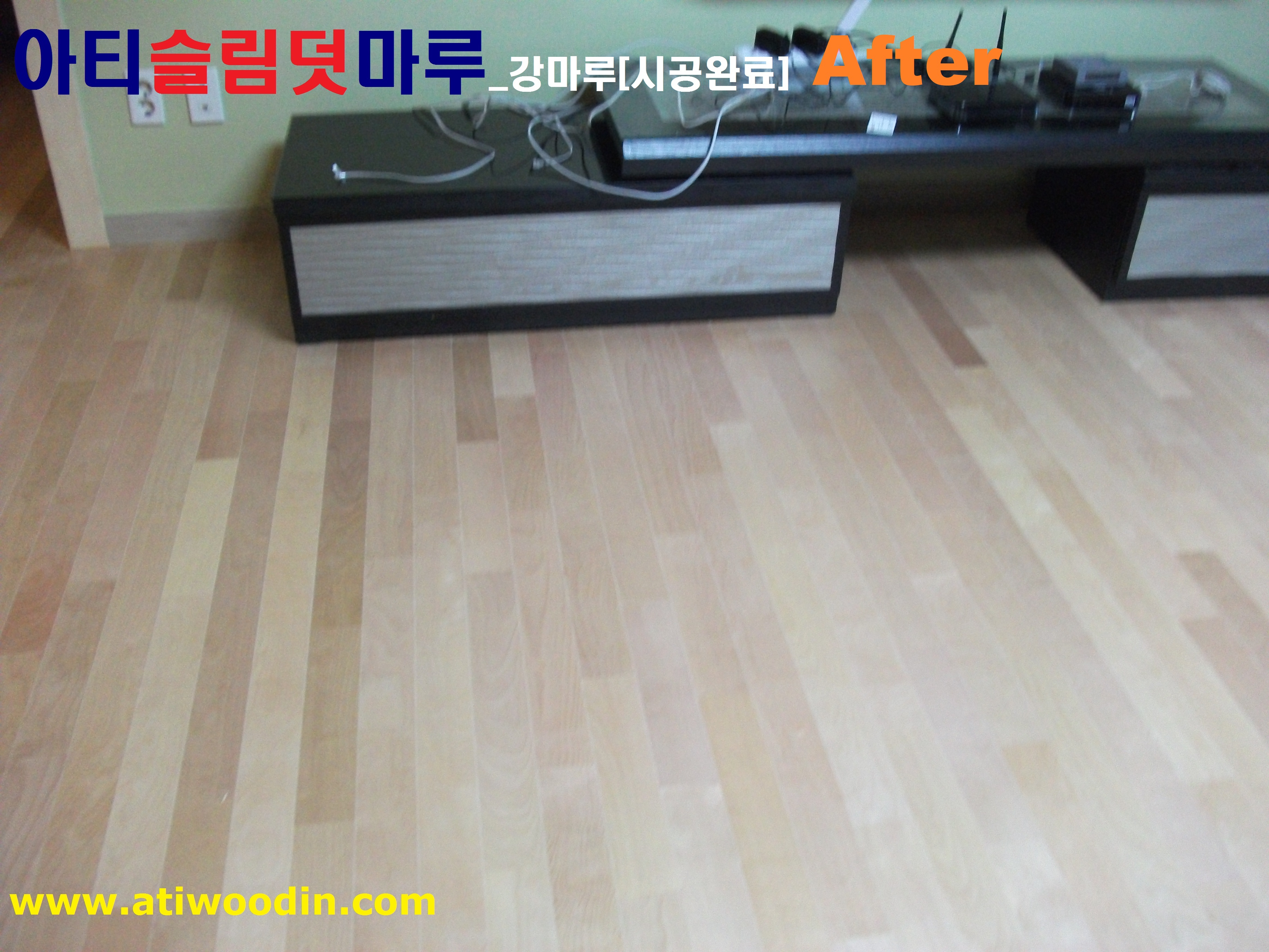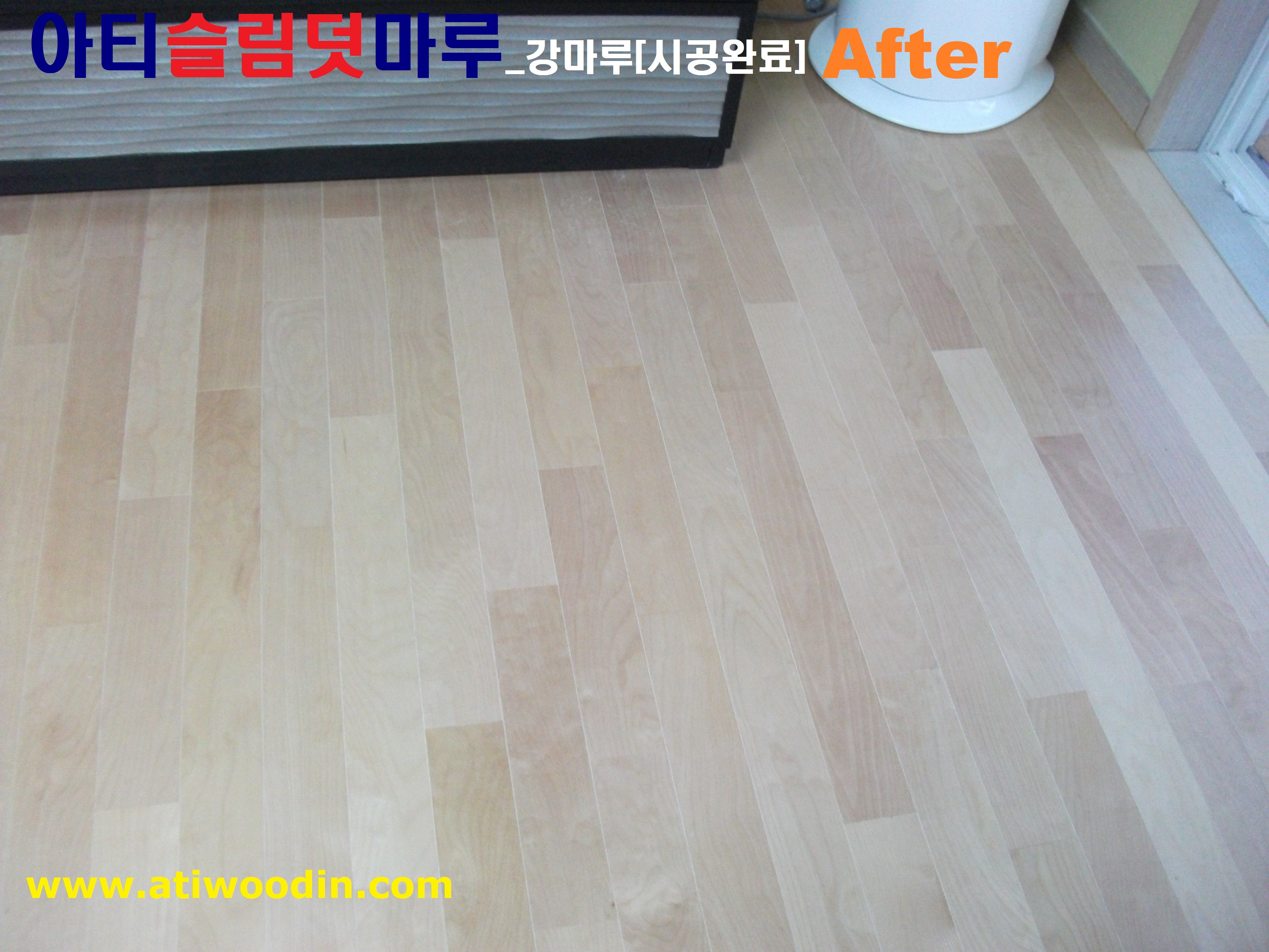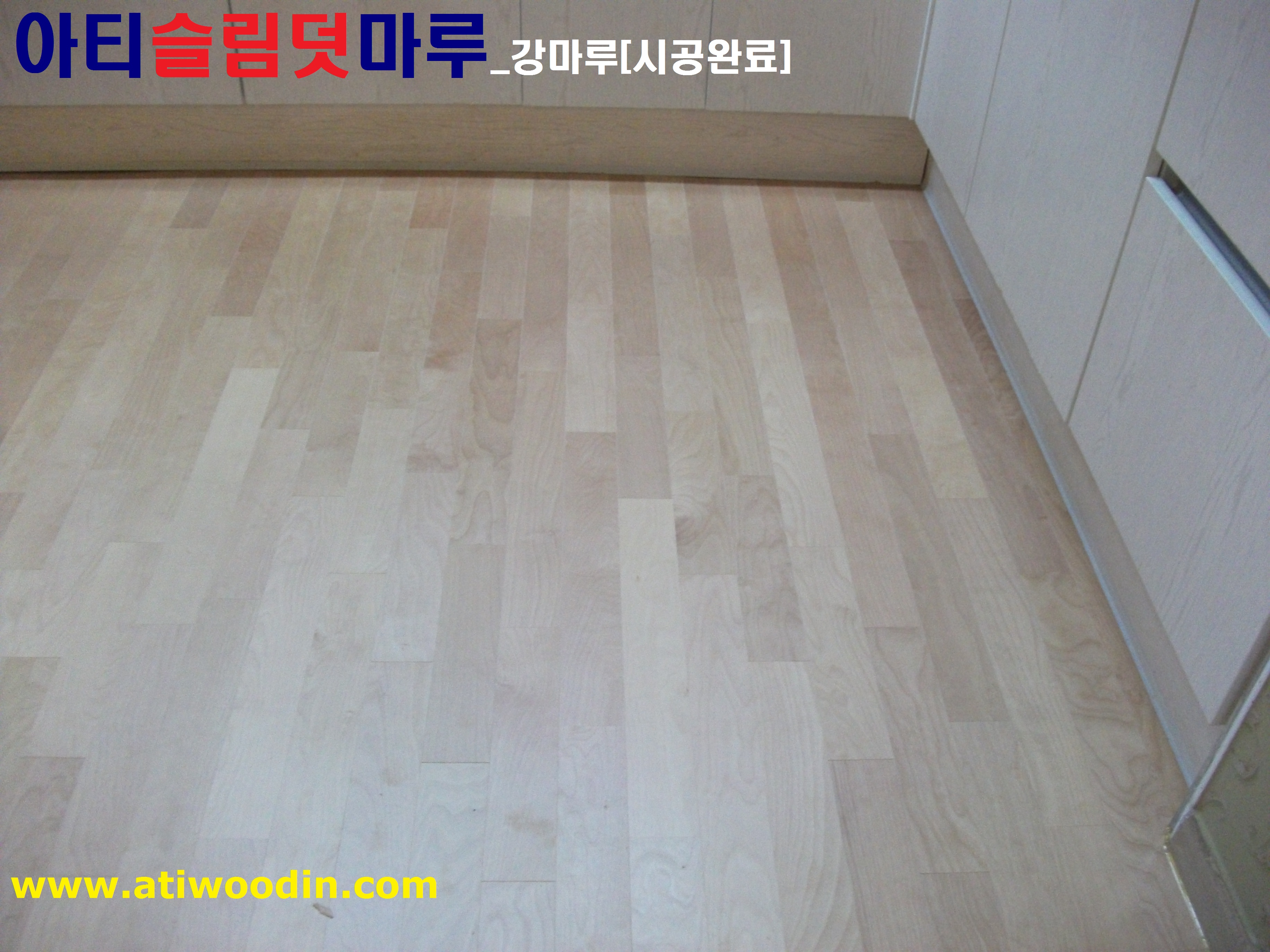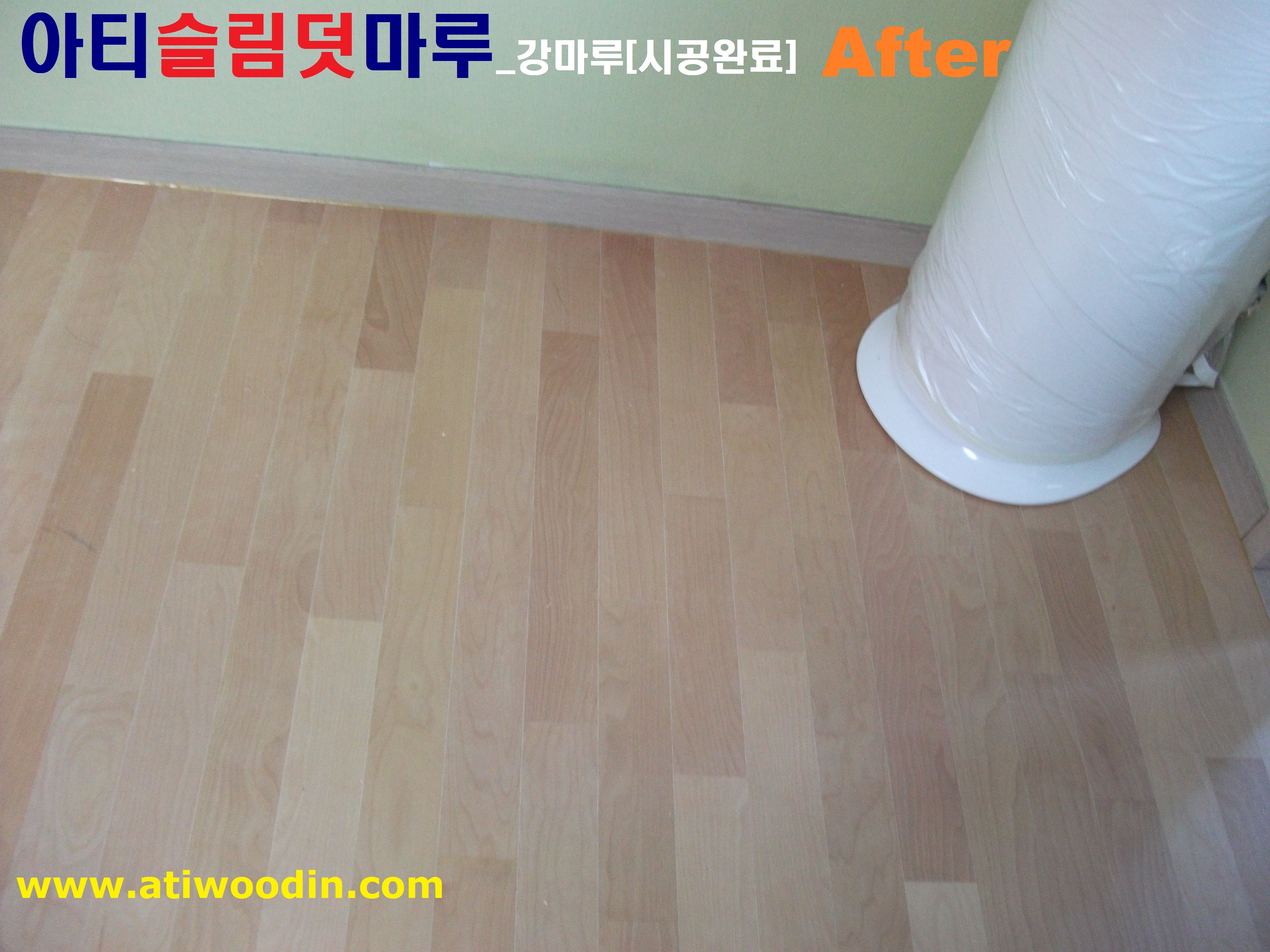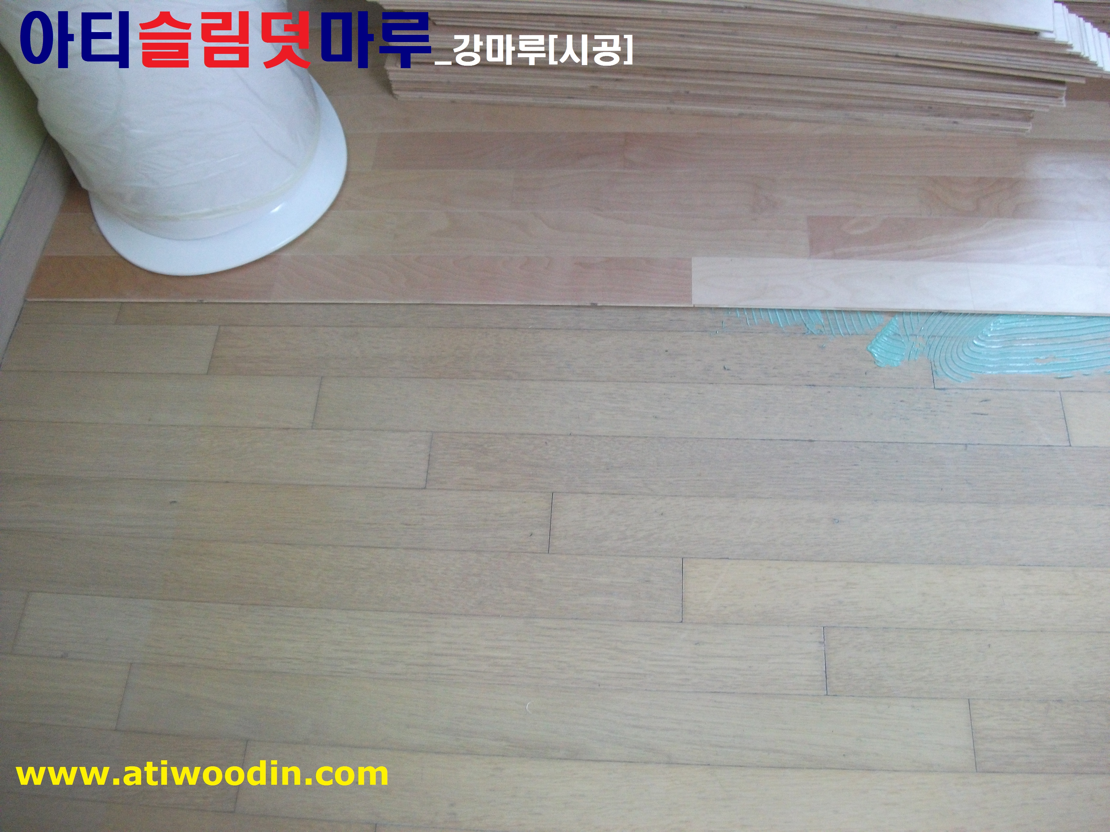 원목마루용 친환경접착제에의한 강마루 바닥재를 밀착시공하여 시간이 지나도 들뜸현상이 없어 결로현상이 발생되지 않아 기존마루에 영향이 없으며 표면은 긁힘이나 스크래치가 강한 강마루제품을 사용하며 친환경접착제사용으로 냄새도없어 당일시공후 바로생활 할 수 있는 장점이 있습니다.