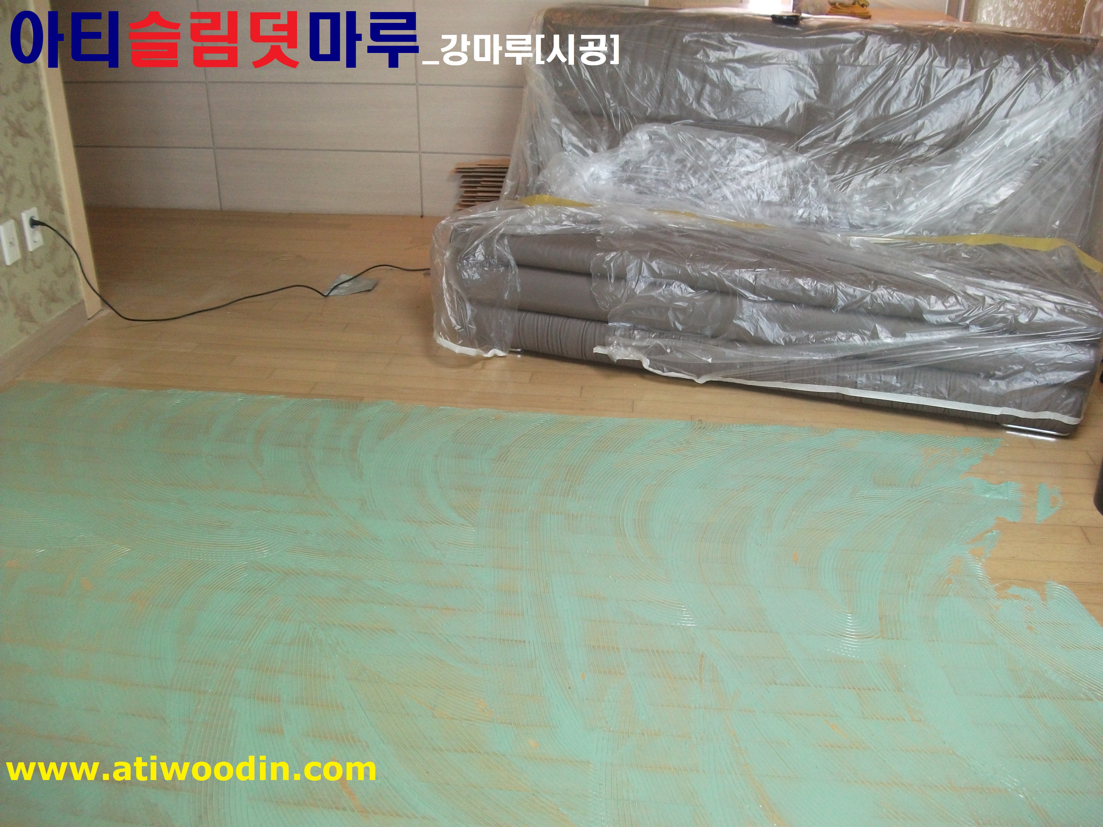 3. 짐운반적용덧마루시공- 냉장고등 큰 짐을 옮겨가면서 친환경접착제에의한 강마루제품으로 덧마루시공