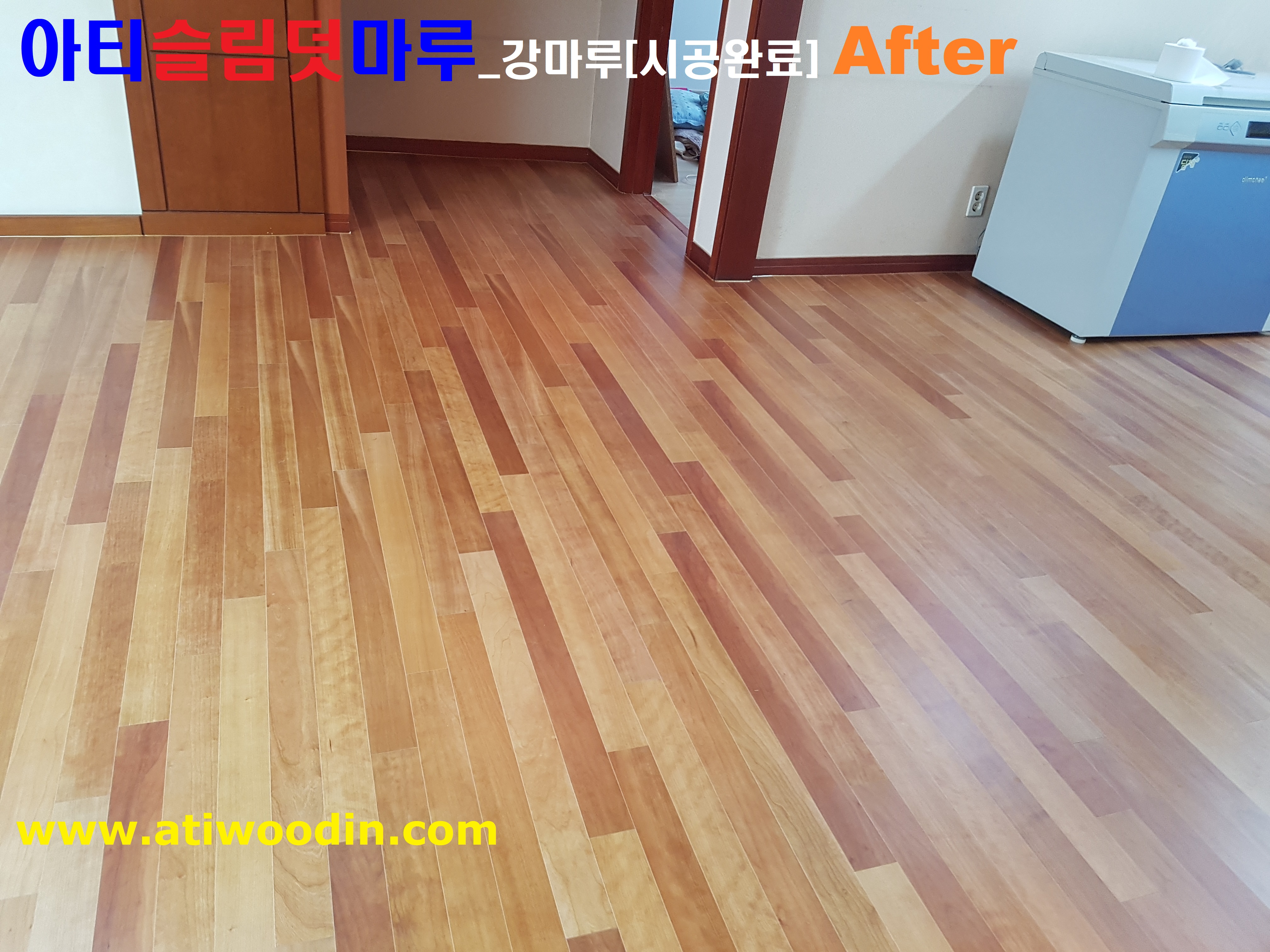 원목마루용 친환경접착제의한 강마루 바닥재로 밀착시공하여 기존마루에 영향없이 마루새단장 할 수 있으며 표면은 긁힘이나 스크래치강한 강마루제품으로 사용하며 친환경접착제사용으로 냄새도 없어 당일시공완료후 바로생활 할 수 있는 장점이 있으며 결로현상보완 기존마루에 영향이 없으며 현관입구, 화장실입구, 방문입구는 덧마루전용 알루미늄 재료분리대를 적용하여 시공마감 진행합니다.