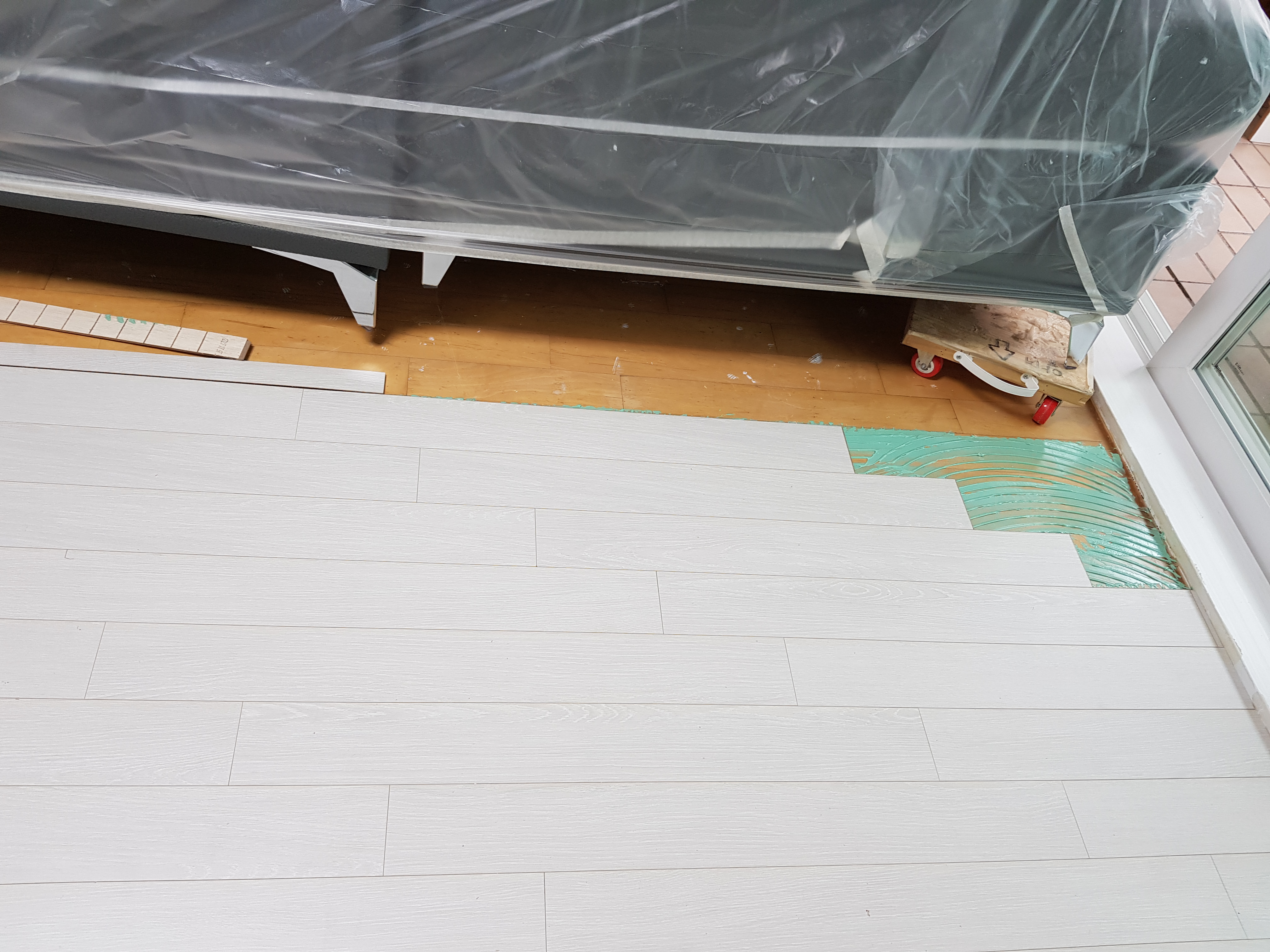 3. 짐운반적용덧마루시공 -원목마루용 친환경접착제에의한 나무재질의 바닥재를 사용하여 쇼파 냉장고등 큰 짐을 옮겨가면서 덧마루 밀착시공