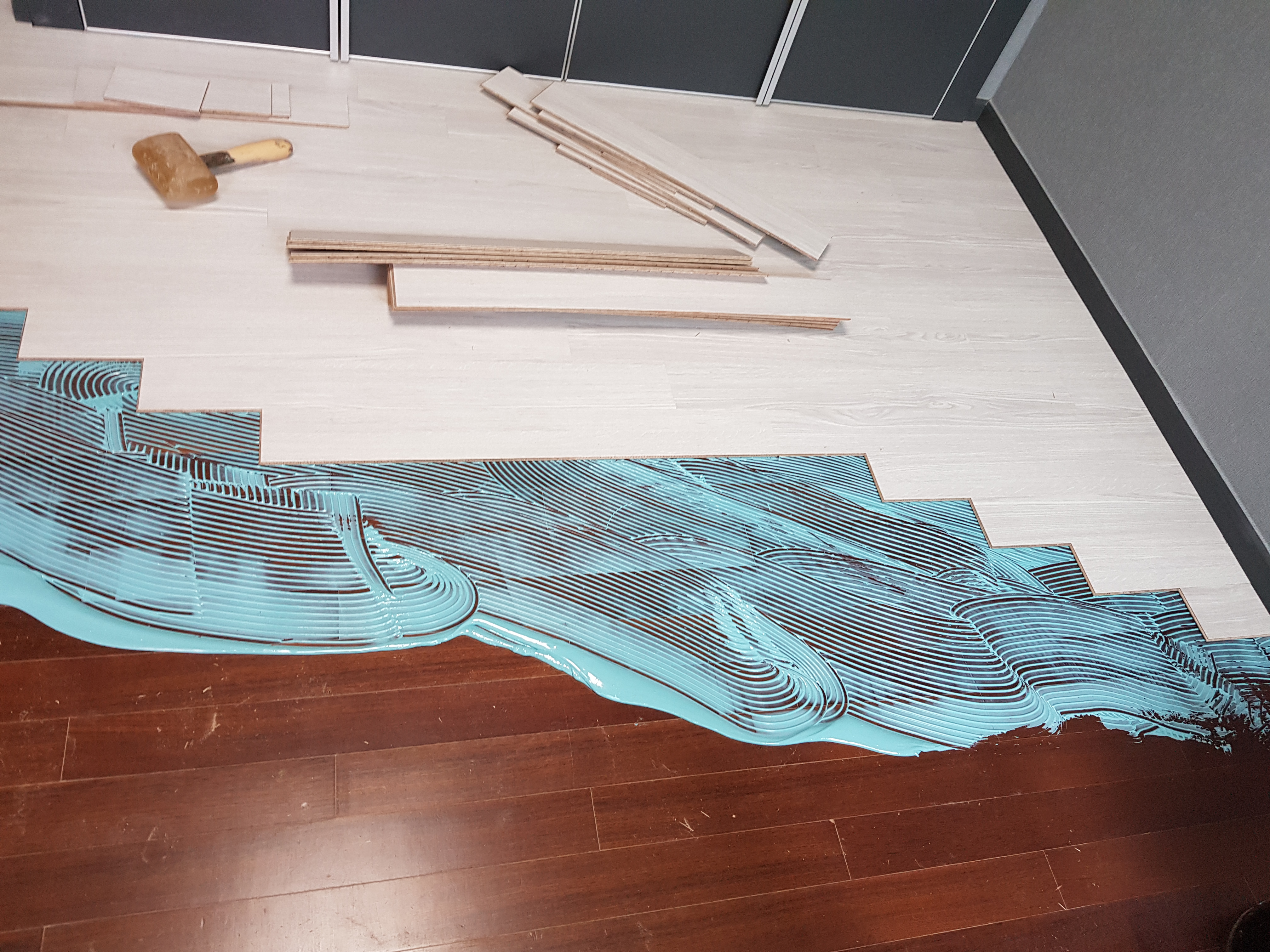 3. 덧마루시공 - 큰 짐을 옮겨가면서 원목마루용 친환경접착제에의한 표면이 강한 강마루제품으로 밀착시공