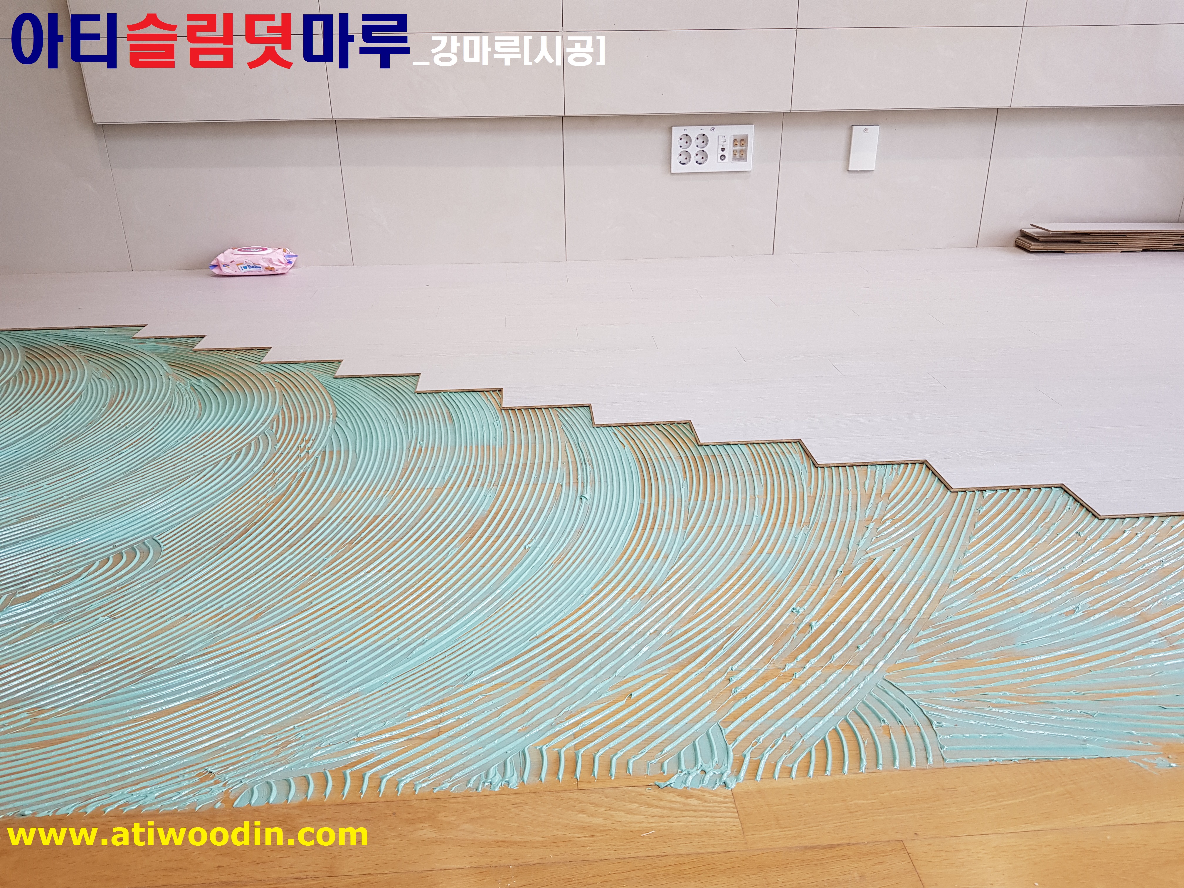 3. 덧마루시공 - 큰 짐을 옮겨가면서 원목마루용 친환경접착제에의한 표면이 강한 강마루제품으로 밀착시공