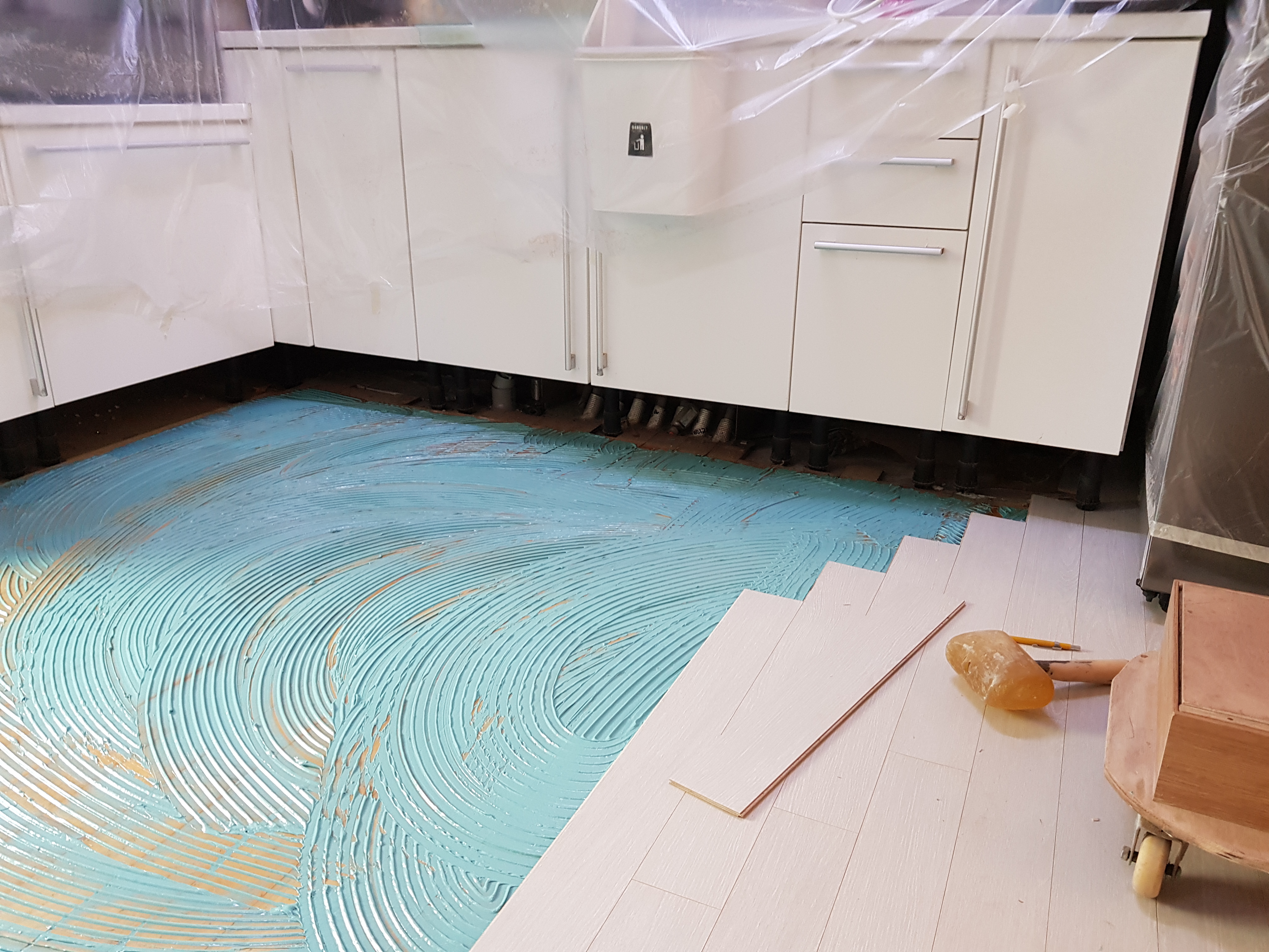 3. 덧마루시공 - 큰 짐을 옮겨가면서 원목마루용 친환경접착제에의한 표면이 강한 강마루제품으로 밀착시공
