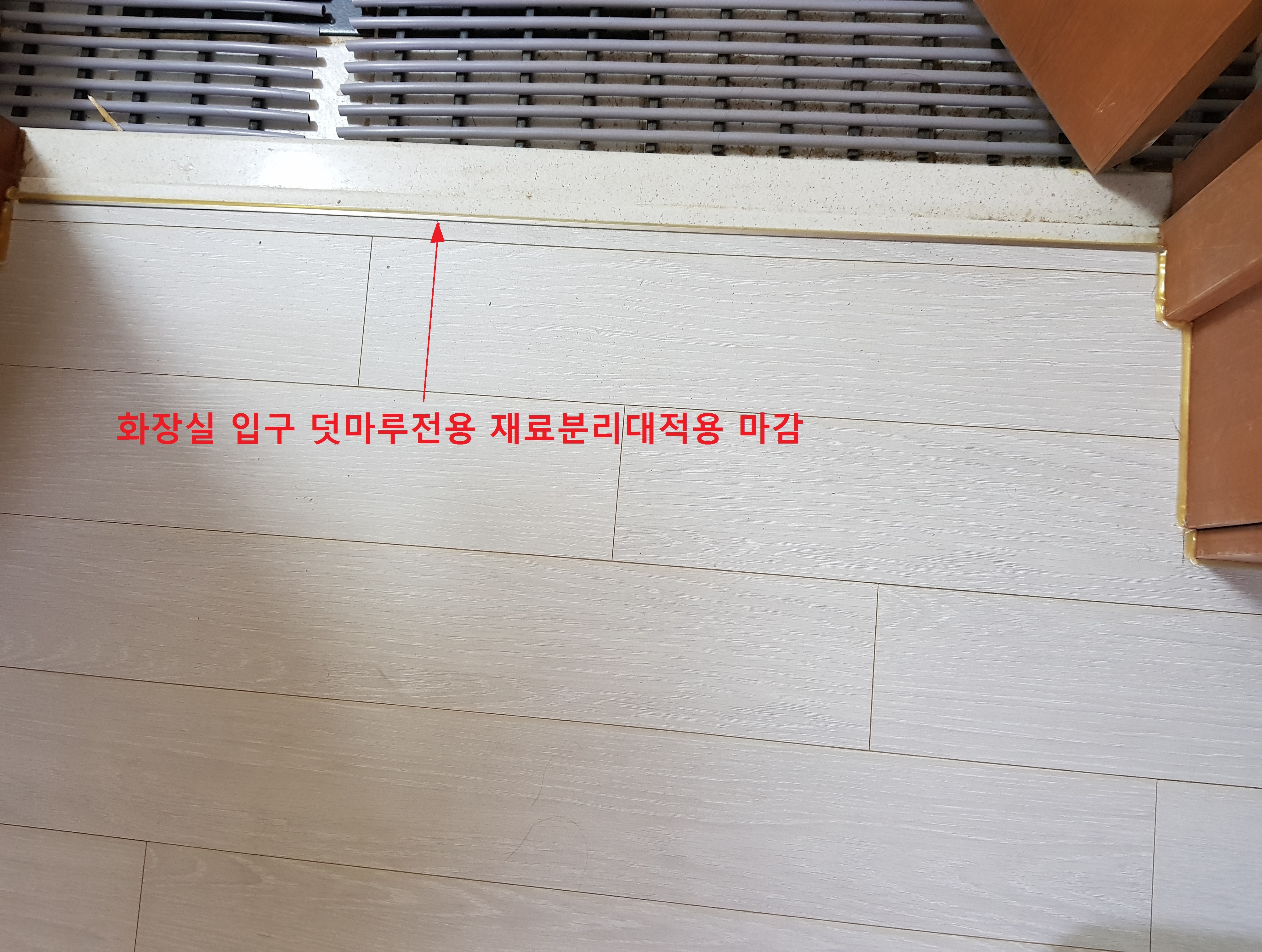 현관입구, 화장실입구, 침실방입구의 마감이 필요할 경우는 덧마루전용 알루미늄재료분리대를 적용하여 깔끔하게 시공마감 진행을 합니다.