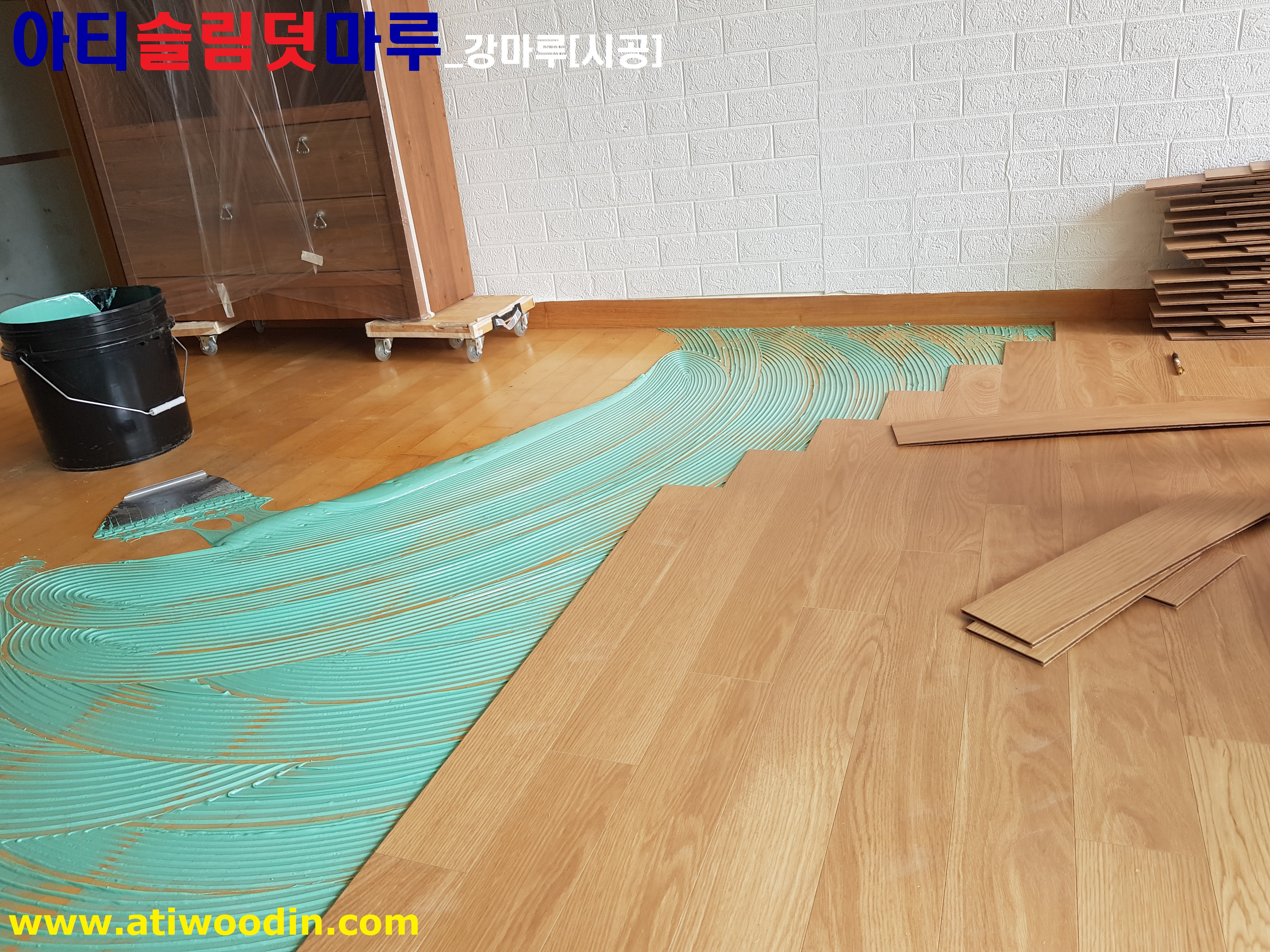 노후바닥에 대한 교체를 최대한 빠른시간내에 원목마루용 친환경접착제에의한 강마루제품으로 밀착