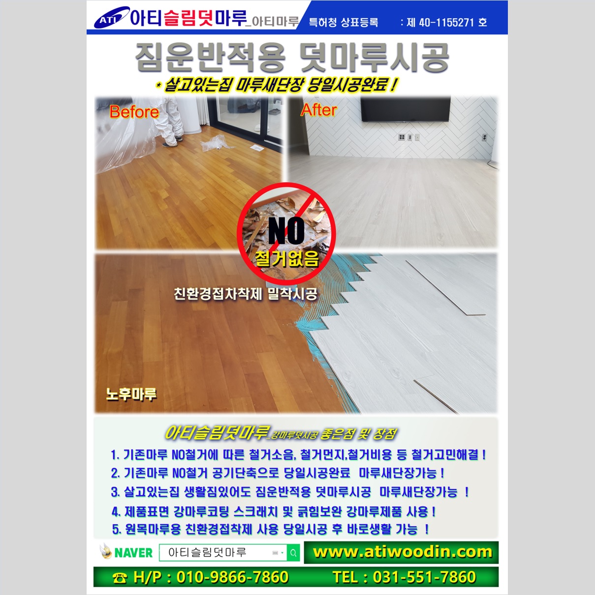 기존 노후마루에 대한 NO철거로 철거소음, 철거먼지, 철거비용과 시간등 철거고민없이 당일시공완료