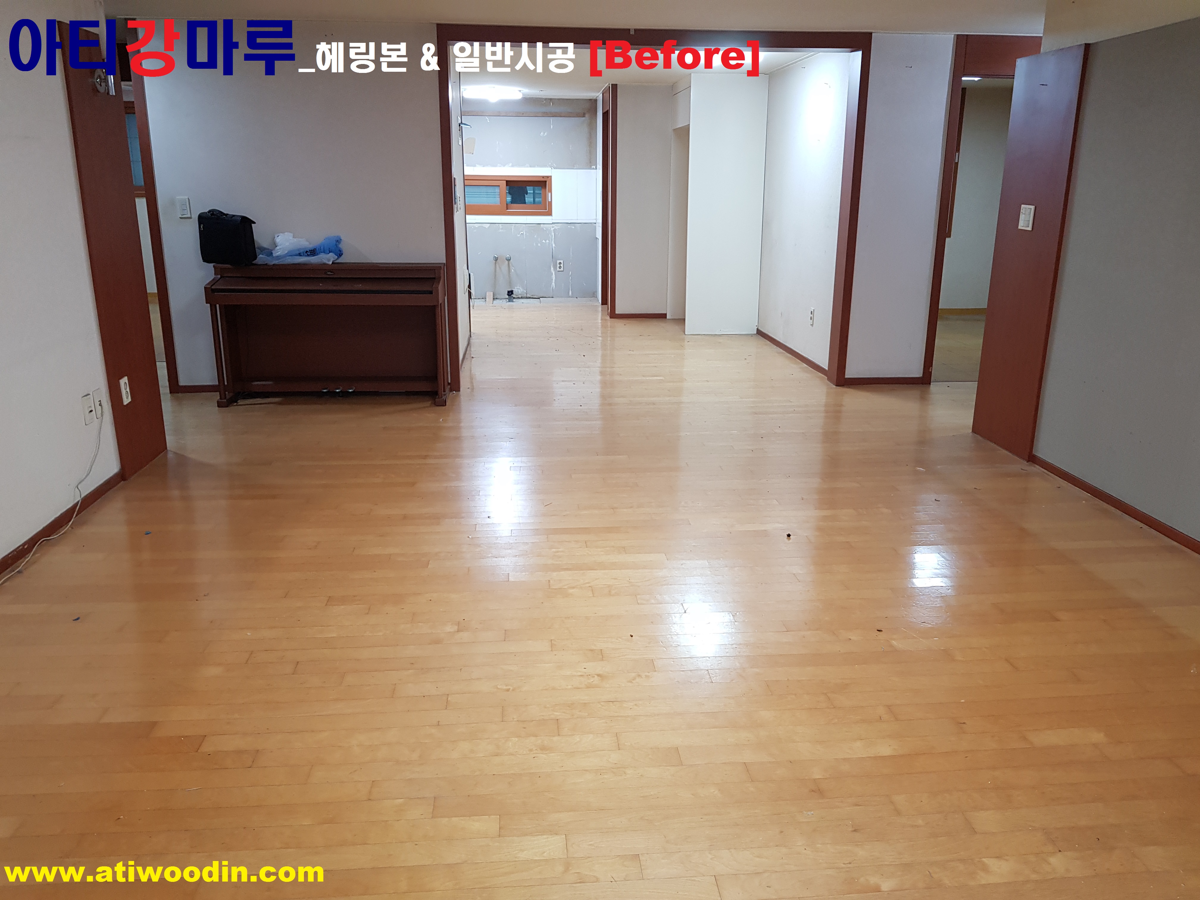 이사하기전 비워있는집에 대한 노후온돌 마루 철거후 원목마루용 친환경접착제에의한 강마루 및 온돌마루제품 과 헤링본제품으로 마루시공 방법입니다.