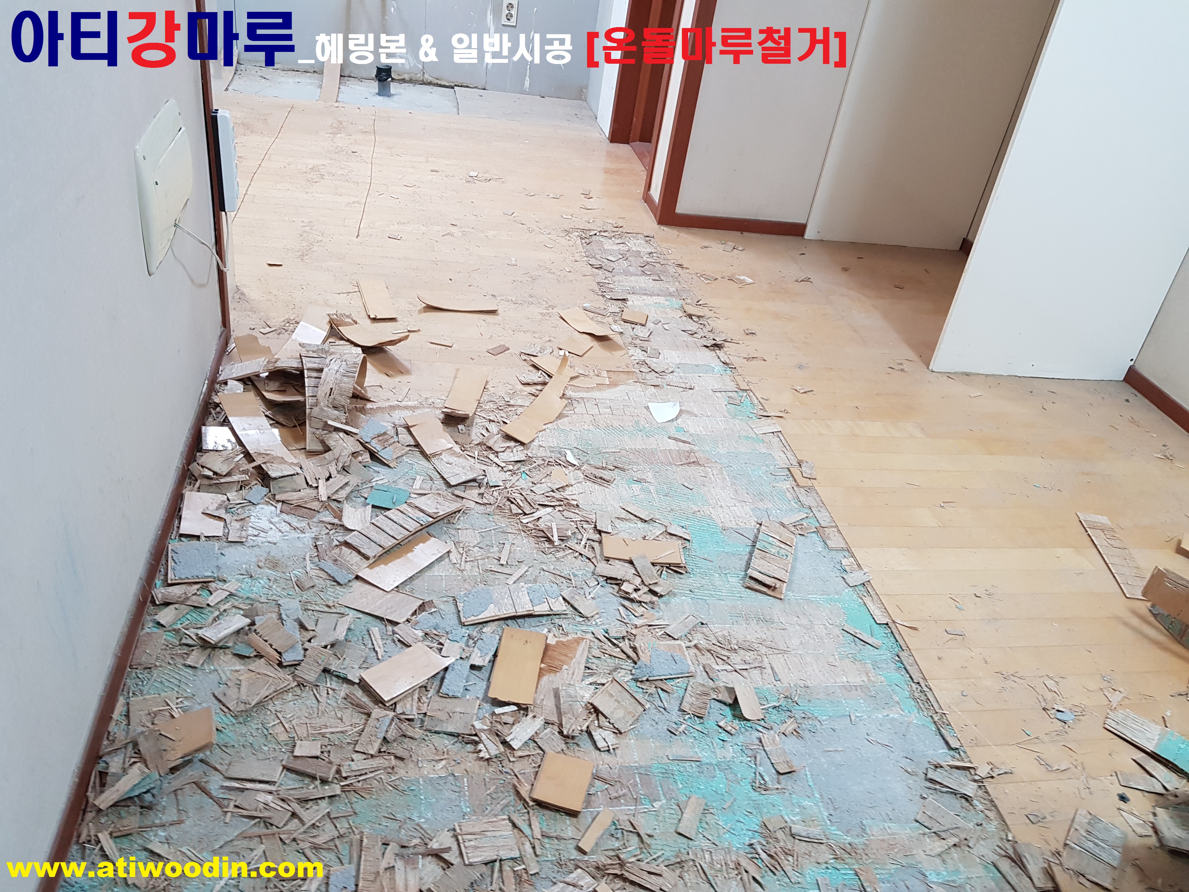 이사하기전 비워있는집에 대한 노후온돌 마루 철거후 원목마루용 친환경접착제에의한 강마루 및 온돌마루제품 과 헤링본제품으로 마루시공 방법입니다.
