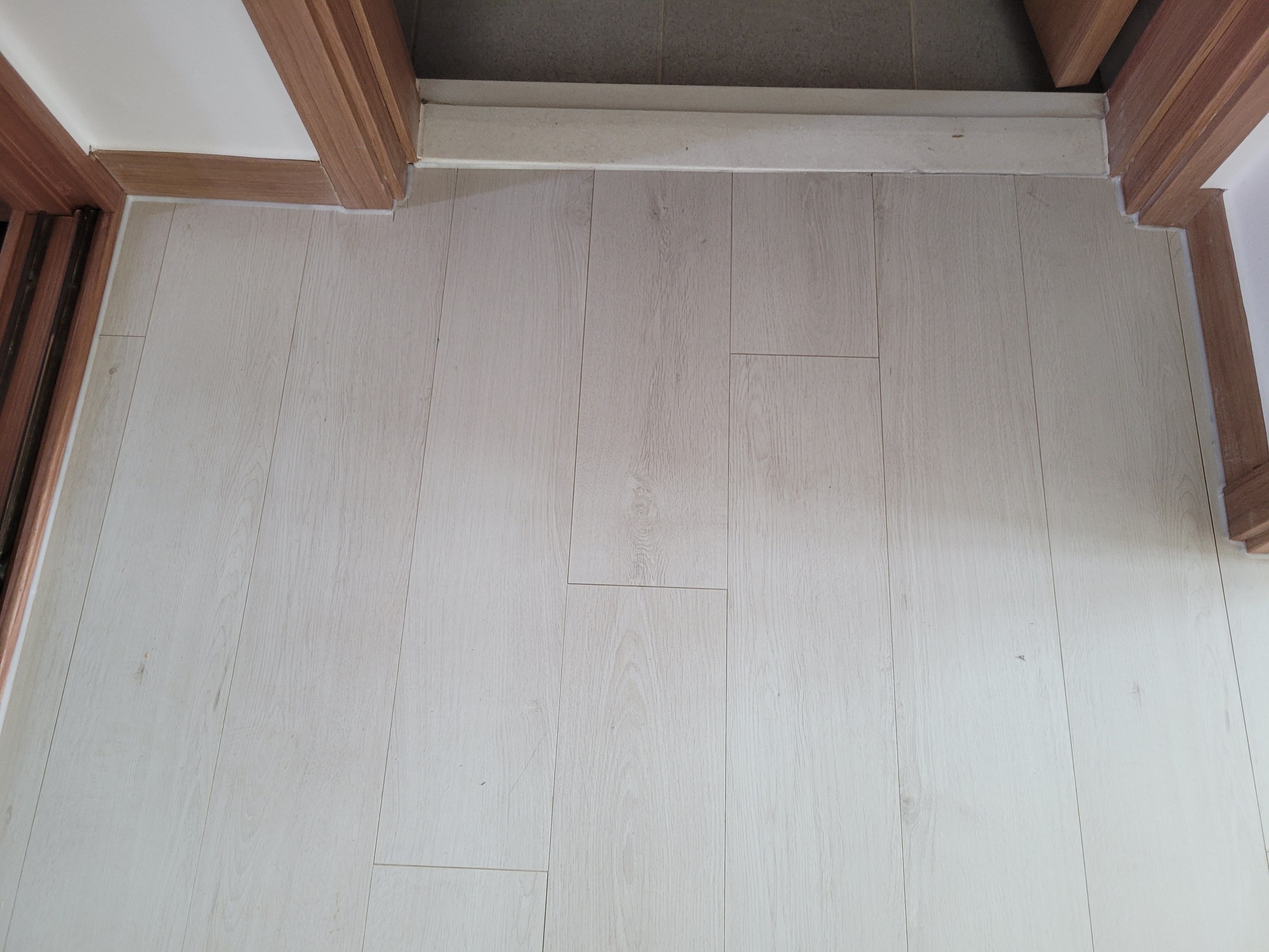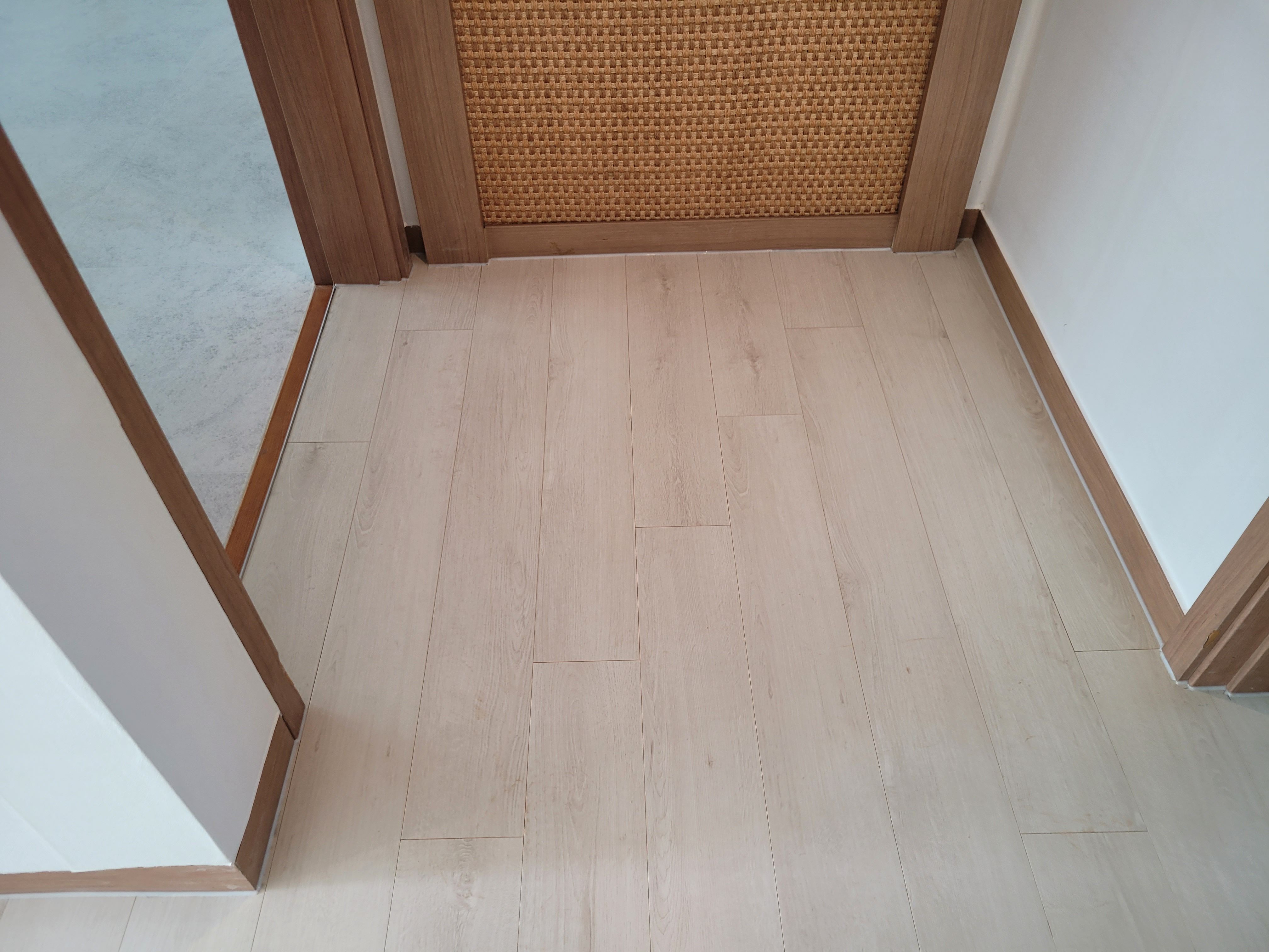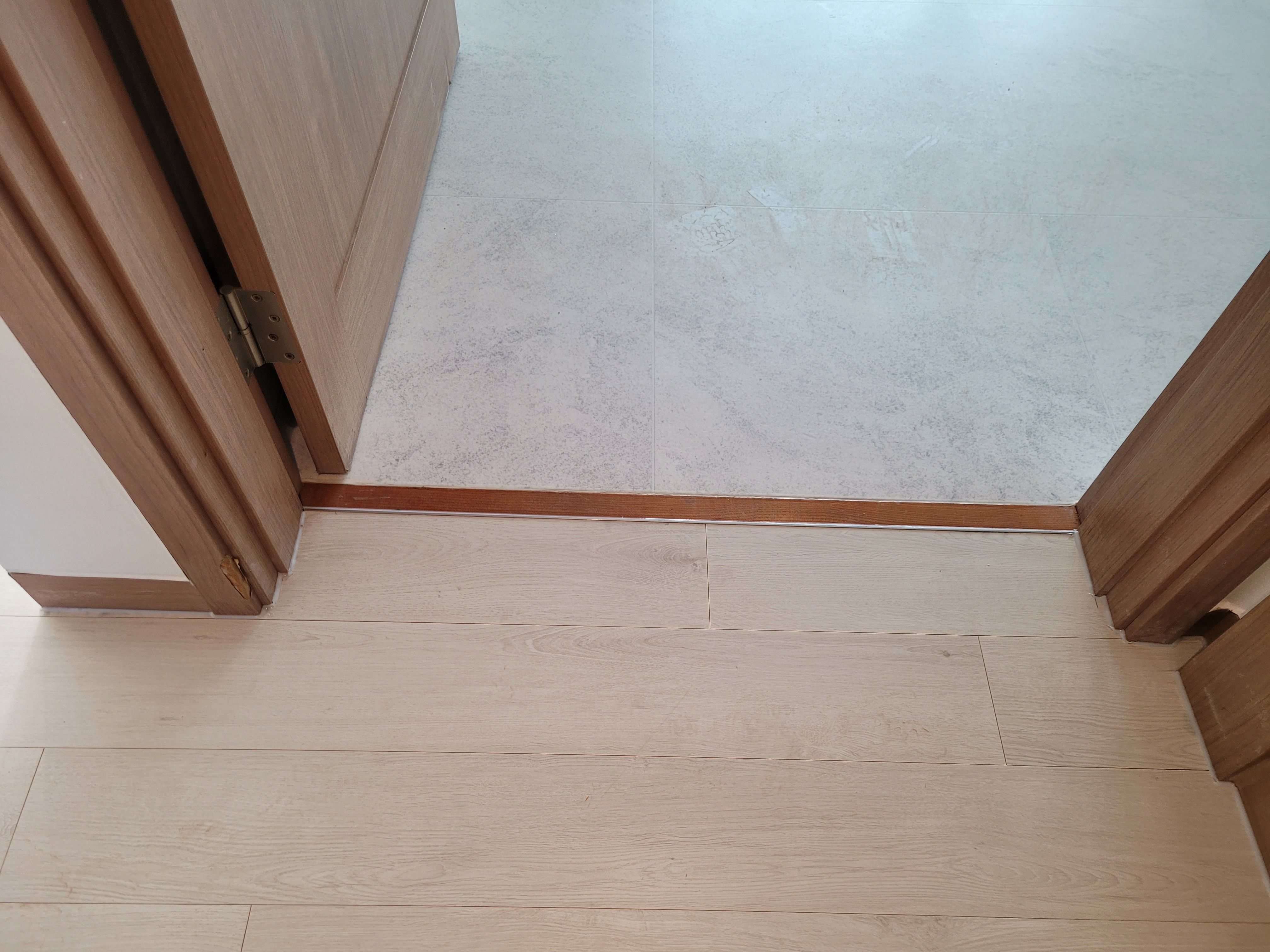 덧마루시공에 따른 현관입구, 화장실입구, 방문입구등 마감은 덧마루전용 알루미늄재료분리대를 적용하여 깔끔하게 시공 마감할 수 있습니다.